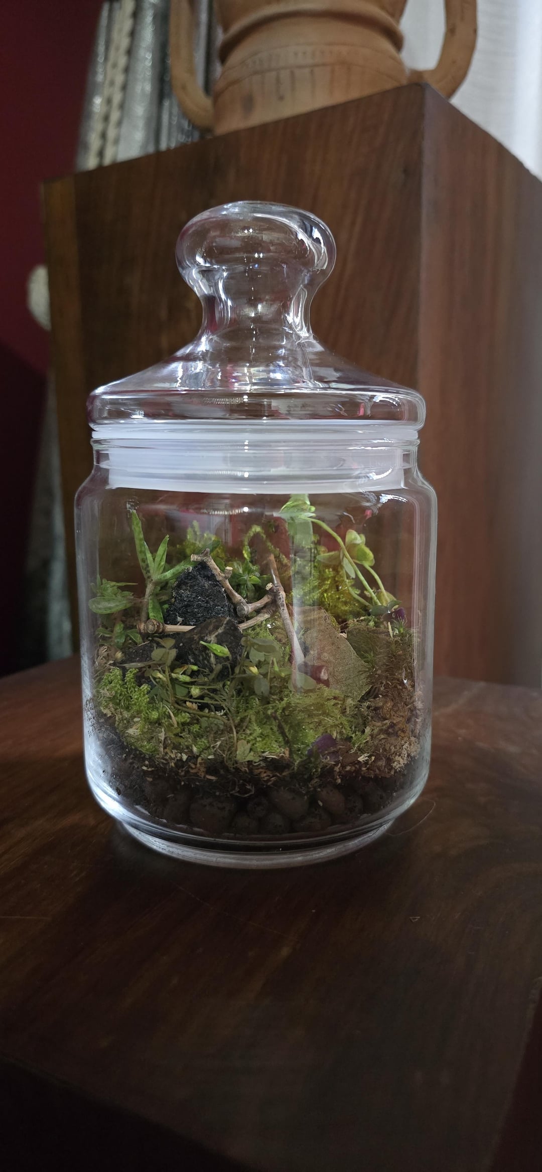 Wanted to make terrarium from long time… Finally bought moss but didn't have large container which was better for a beginner but I can't resist myself to make one from whatever I got . So bought this little jar and all the plants which I used is from my terrace. Can't wait so I can buy some good rocks and driftwood but this is my first try and don't know if the plants which I choose gonna last in closed and indirect low light. Hope it gonna survive .