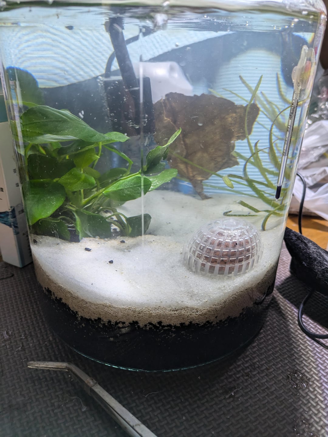In the jar I used bio soil for the bottom, coral sand and some white GEX sand as the cap. It has 1 Anubis and some dwarf grass type. Also a small filter since I'm hoping to add shrimp in it.