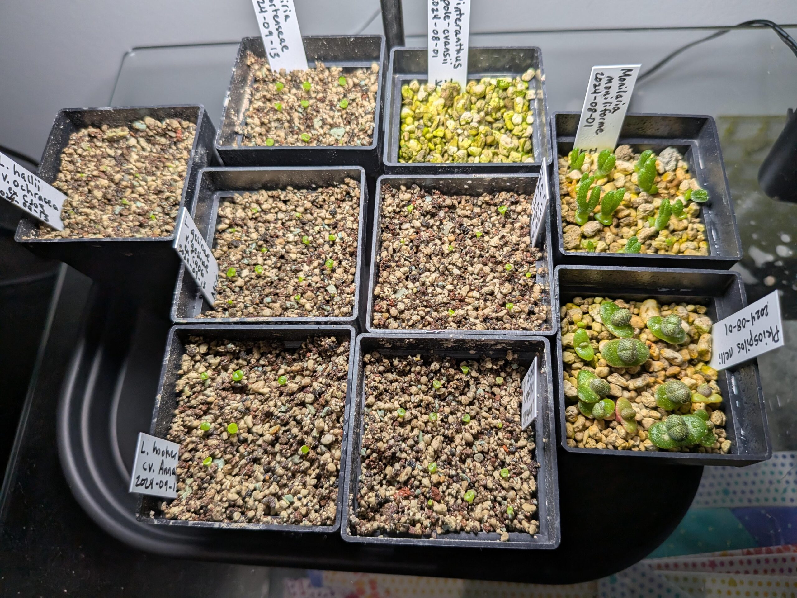 An update on my seedlings: Monilaria and Pleiospilos are doing well, about 10 Dinteranthus are alive in there somewhere, and I have 9 Muiria and a bunch of lithops sown September 1. Keeping them all indoors for the winter.