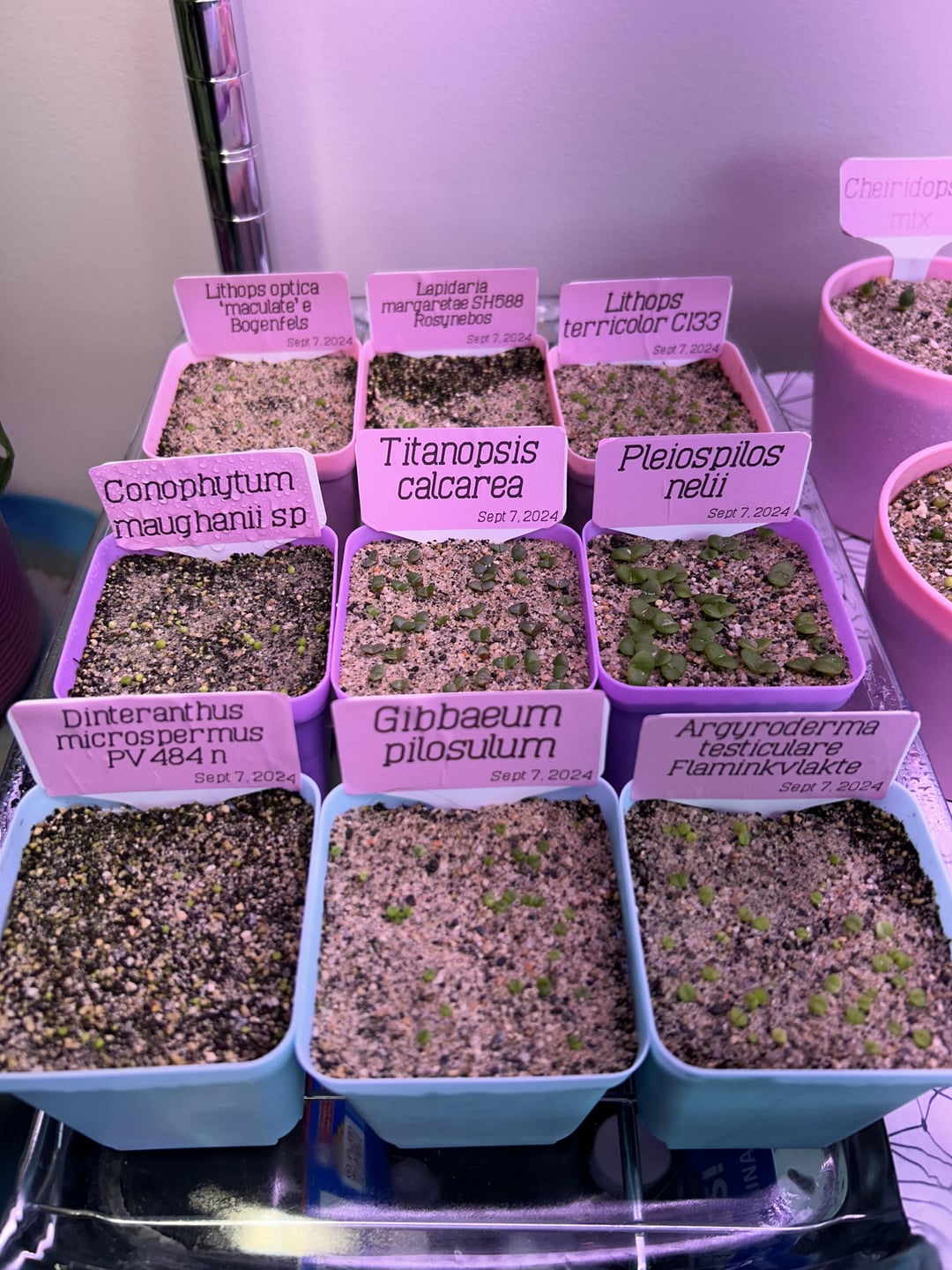 Started my first seed batches in July, and have dialled in my process since then I think! These guys are looking good for the most part! Sown September 7th, pics from the 26th. The p. Nellii got me excited with their size! Dinteranthus are soooooo tiny they’re stressing me out lol.