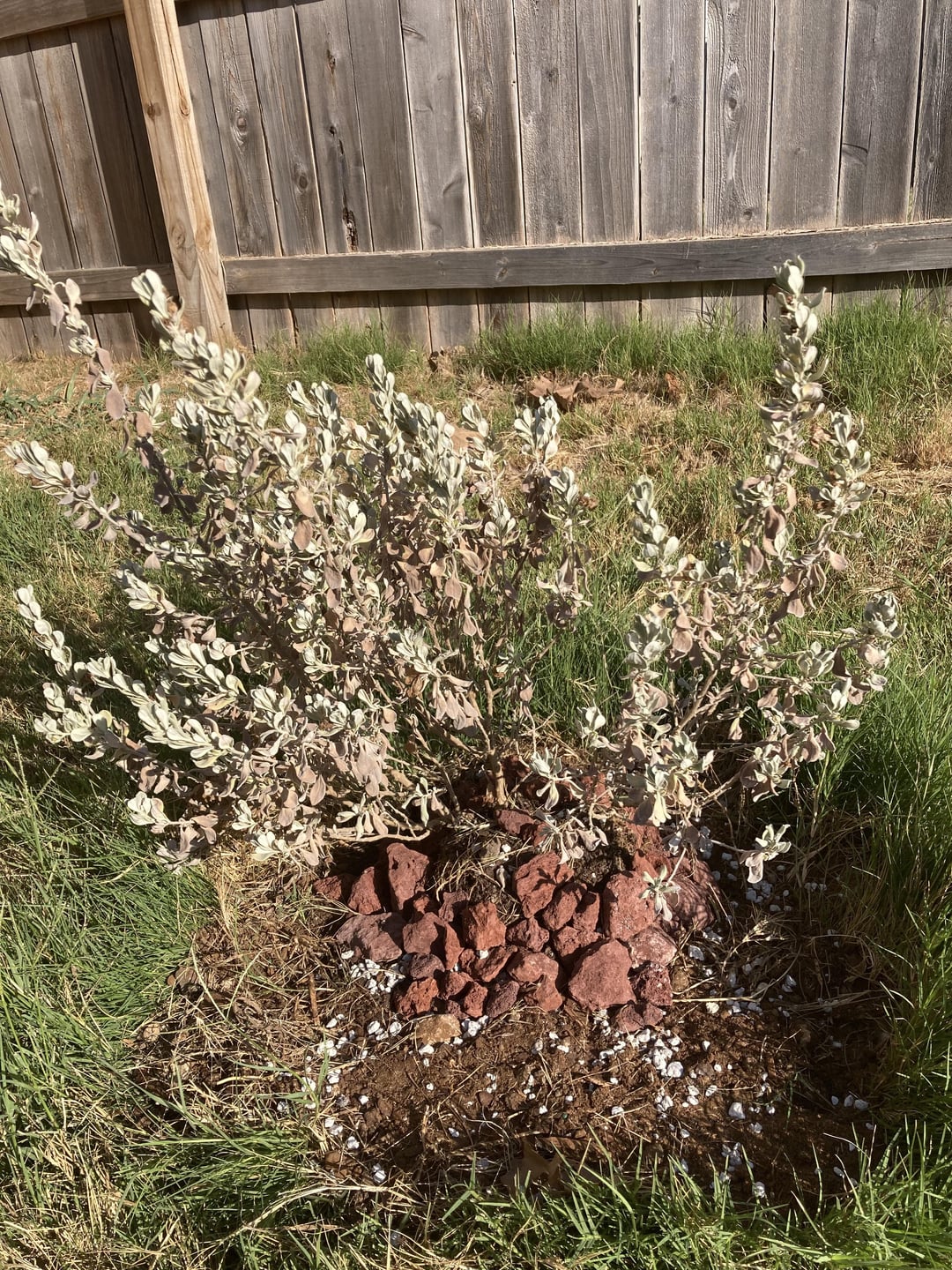 I bought a Texas Sage (San Antonio Rose variety) from Home Depot about a month ago, and it’s been slowly declining ever since I put it in the ground. Leaves are drooping, turning brown. I’m surprised because I thought this plant was supposed to be hardy af. Granted, it is summer in Texas, which is not the best time to plant things. At first I thought the heat/dry spell were too much for it, so I gave it some water (on average, I’m watering it once a week until established). I figured, it’s slightly above grade so it shouldn’t stay wet very long. I did add a little mulch so the sun doesn’t sap it dry before the roots can drink. But then today I noticed that the topsoil around it REALLY holds moisture, like still moist two days after watering. So I replaced some of the topsoil near the roots with a succulent soil mix, hoping that will drain better. I put some rocks on the soil instead of organic mulch.