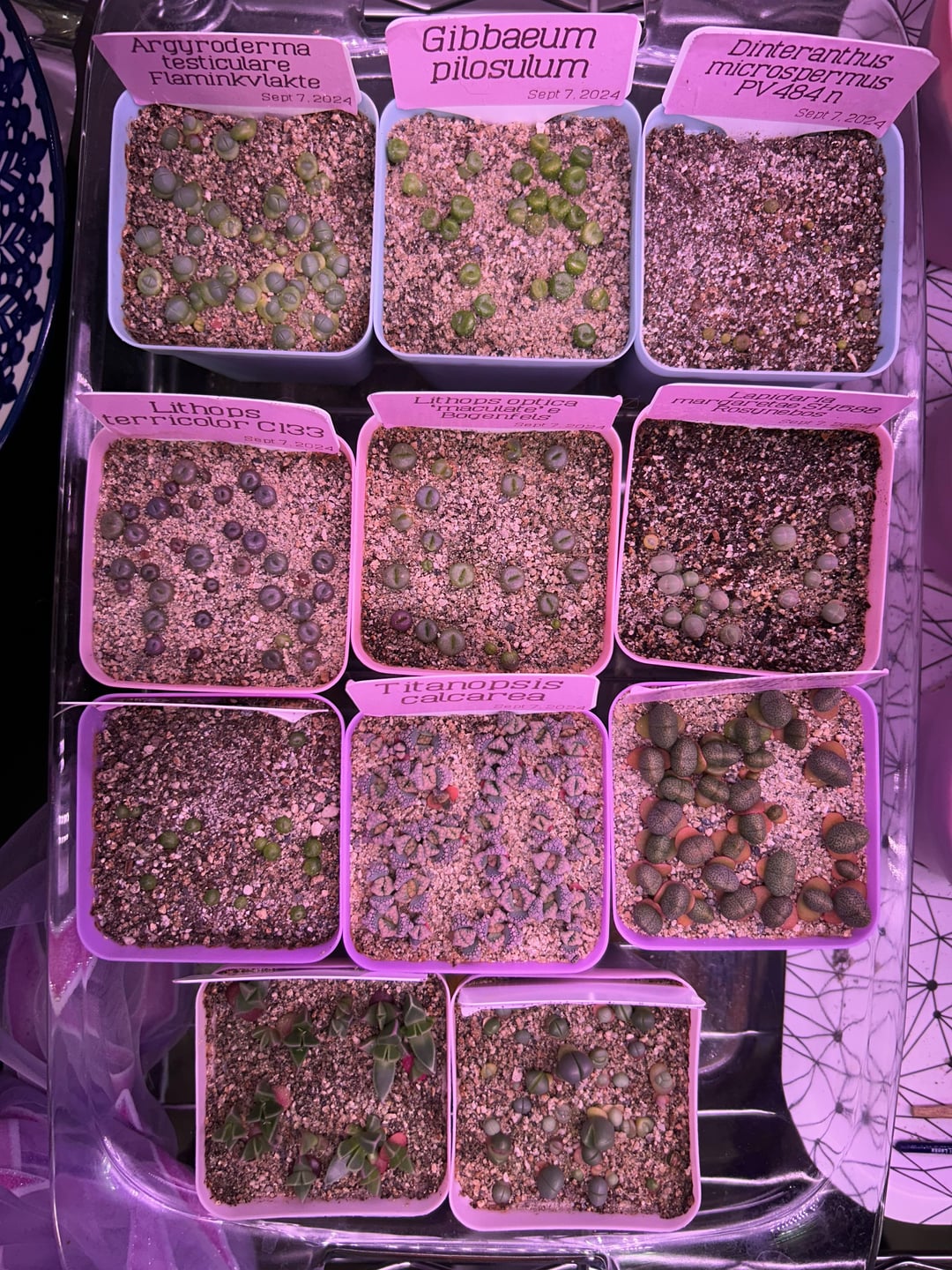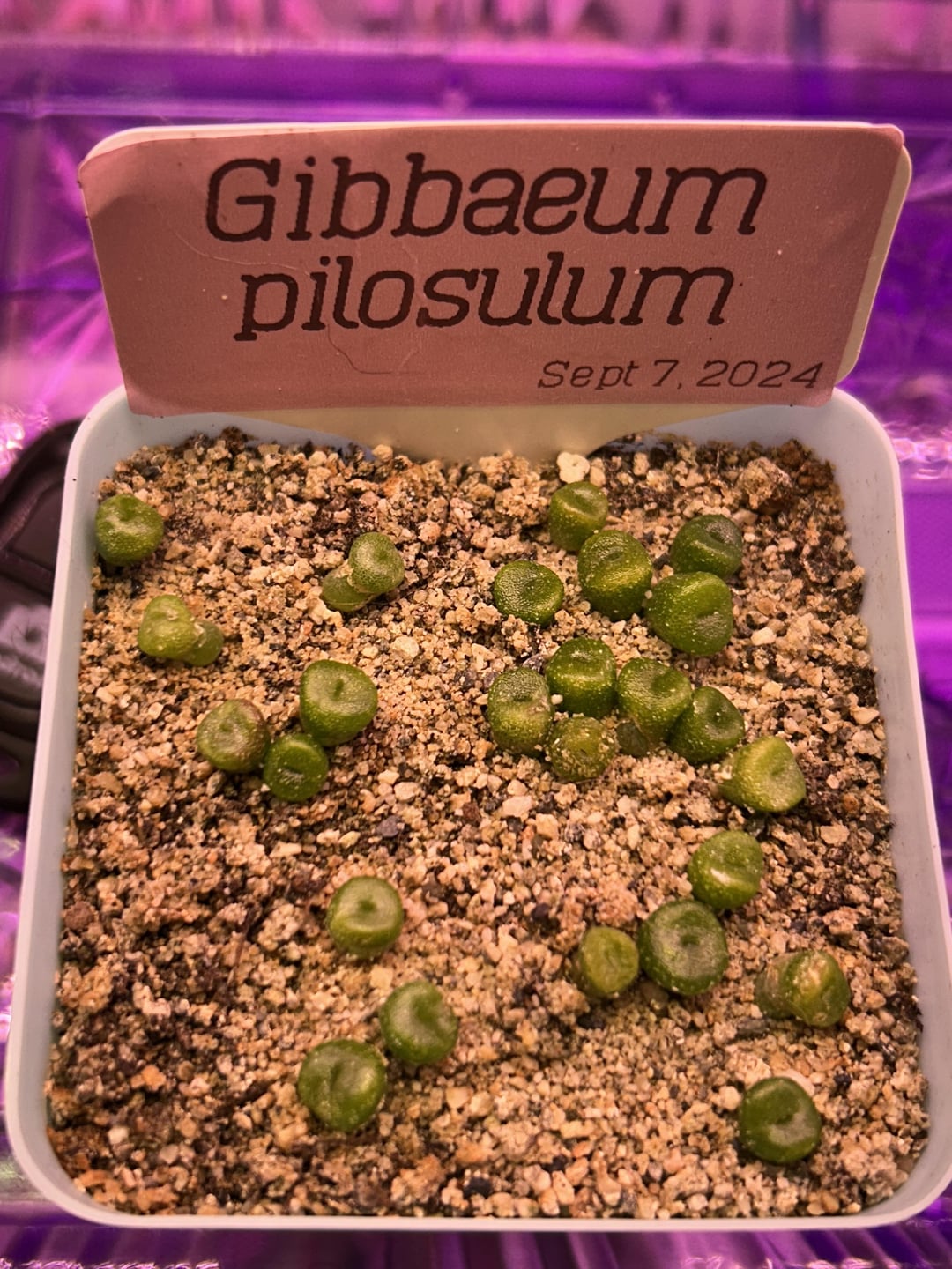 Gibbaeums are starting to get their true leaves, but instead of splitting up too they’re… shucking off the cotyledons like hats? Dunno if normal/common, maybe over watering/fertilizing? This batch planted in 1/4 sifted seedling starting mix.