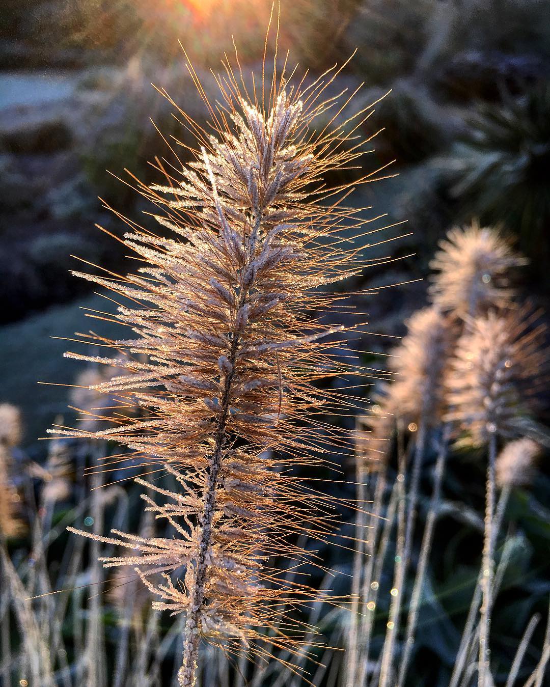 The #frosty #firework-like #explosive #fine #hair of this Pennisetum #grass in the #herbaceous borders @exburygardens, #shimmering in the #low #winter #morning #sun. #magic.