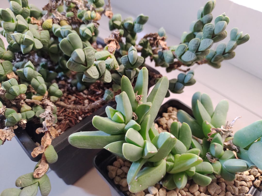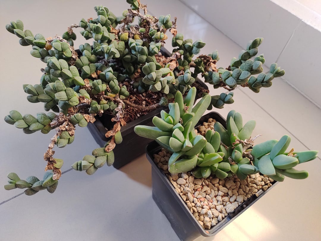 On the left Corpuscularia taylorii wrongly labeled worldwide as Corpuscularia lehmanni. On the right the true Corpuscularia lehmanni with longer leaves.