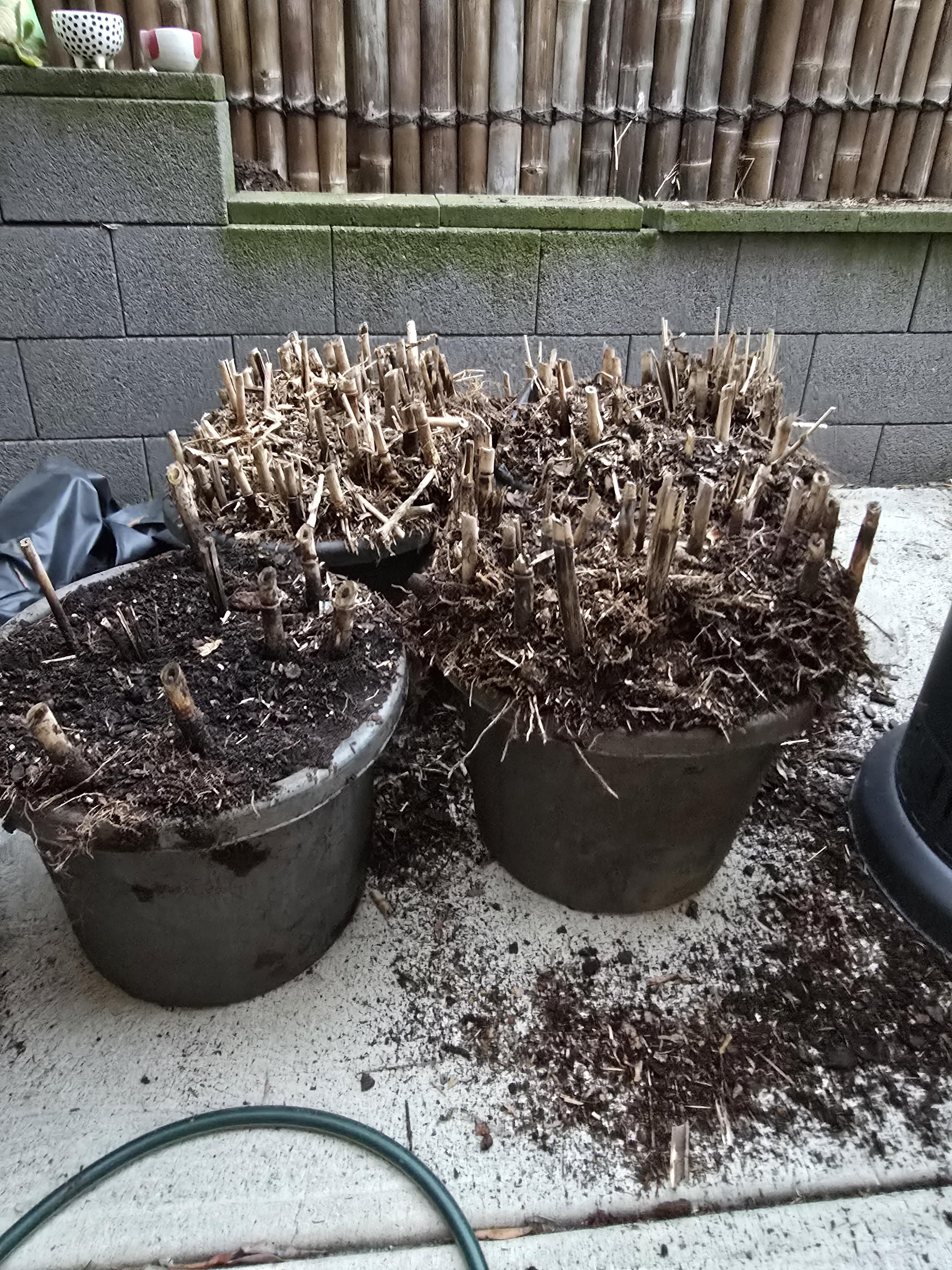 I purchased a crow bar and a hatchet and went to work. As I dug lower, to my surprise, the bamboo were in pots! Buried deep beneath the surface I found 4 pot lips, and this allowed me to pry around, cut through the dense roots that had escaped the pots, remove the pots and clear the roots! Having not done much laborious work, this almost destroyed me. The 3rd pot was particularly difficult and I considered giving up multiple times.