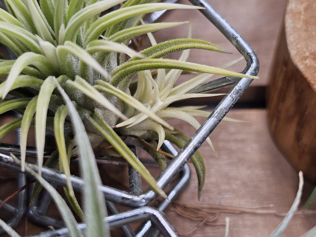 I just found out this ionantha has a pup, and the pup is almost 100% yellowish-white. I'm sure it's not a yellow blush, but a variegation. I'm not knowledgeable with variegated tillandsia, but I'm going to assume it lacks chlorophyll, so I will just let it stay attached to the mother for now.