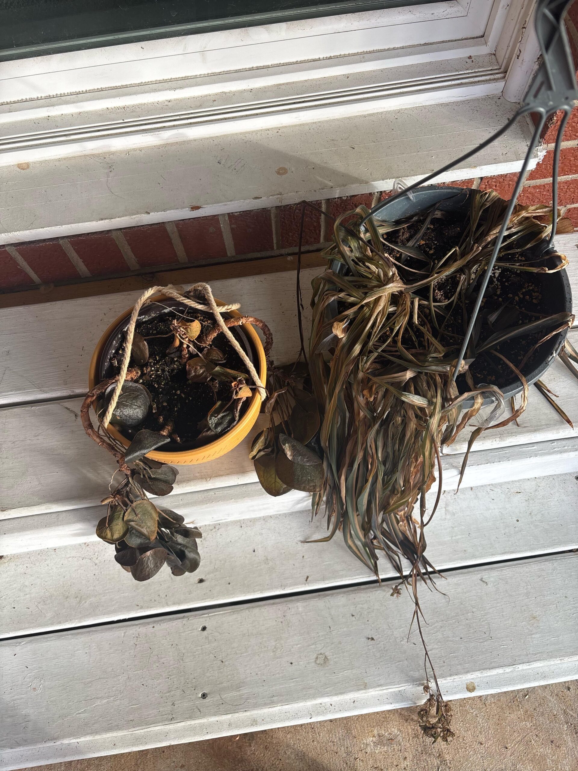 okay so my mom has had these plants for as long as i can remember but this year she moved. we’re located in midwest ohio, these are in a non temp controlled sunroom, so always in sunlight, she said she watered them regularly then they started doing this and she thinks they’re dead. can i do anything? (money plant and spider plant left and right accordingly)