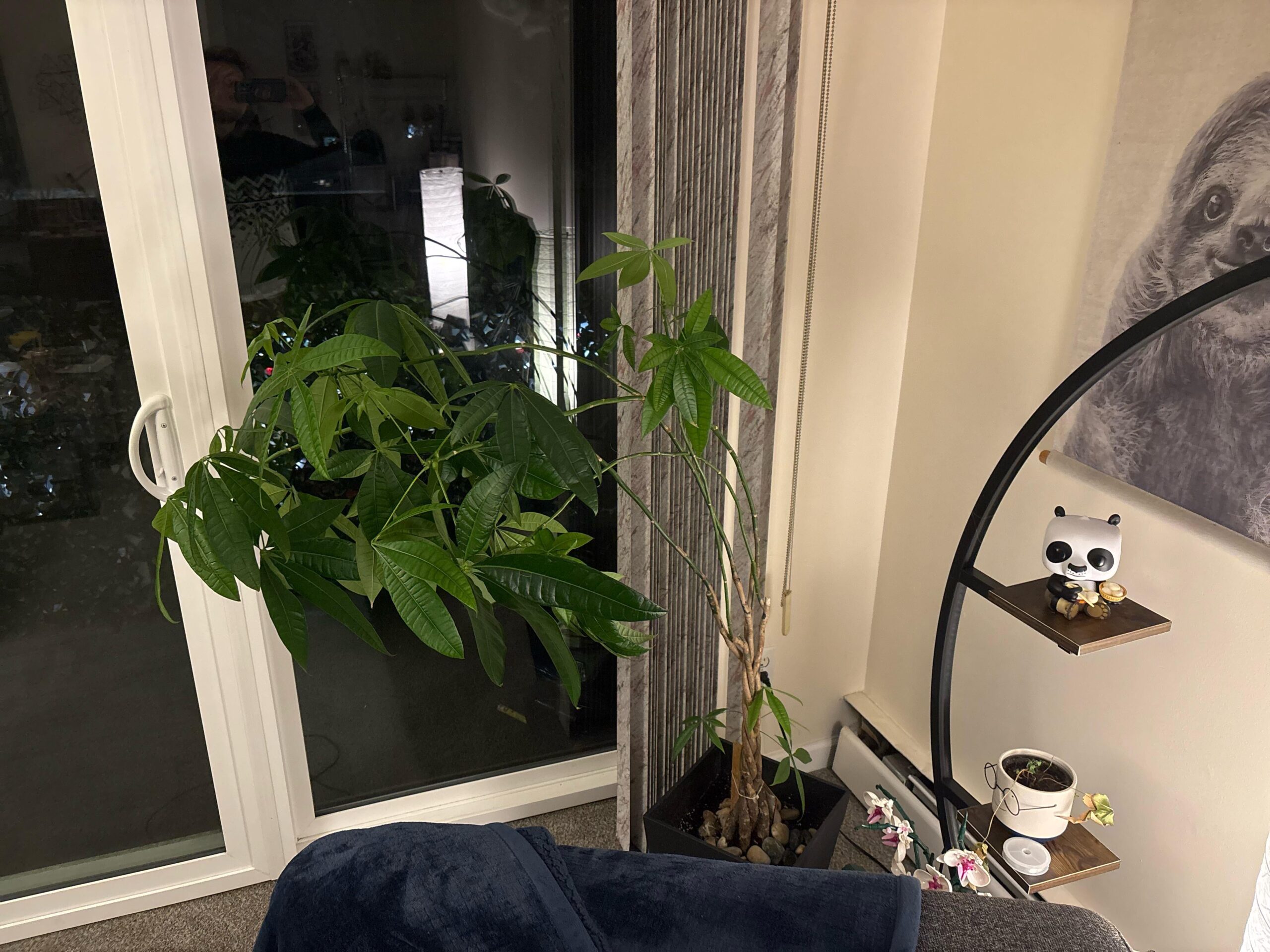 My money tree has lots of steady growth to it but how can I fix its awful droop. It is standing at half its height like this and it’s depressing to look at. I try to water it once a week, it has drainage and is getting decent light here