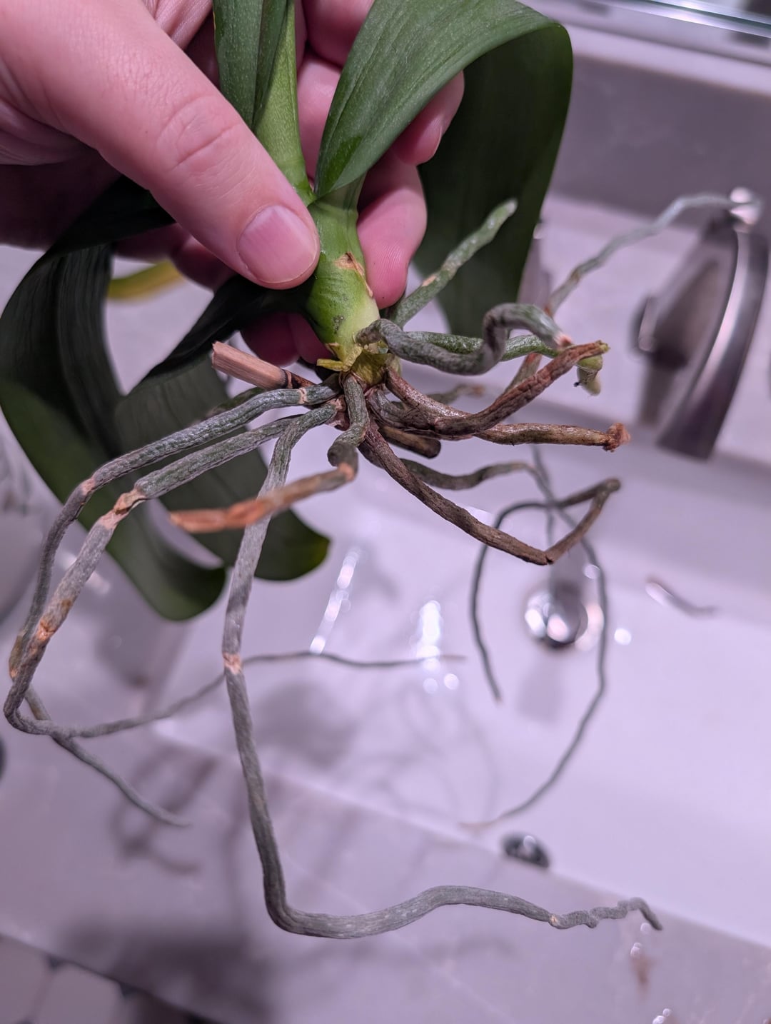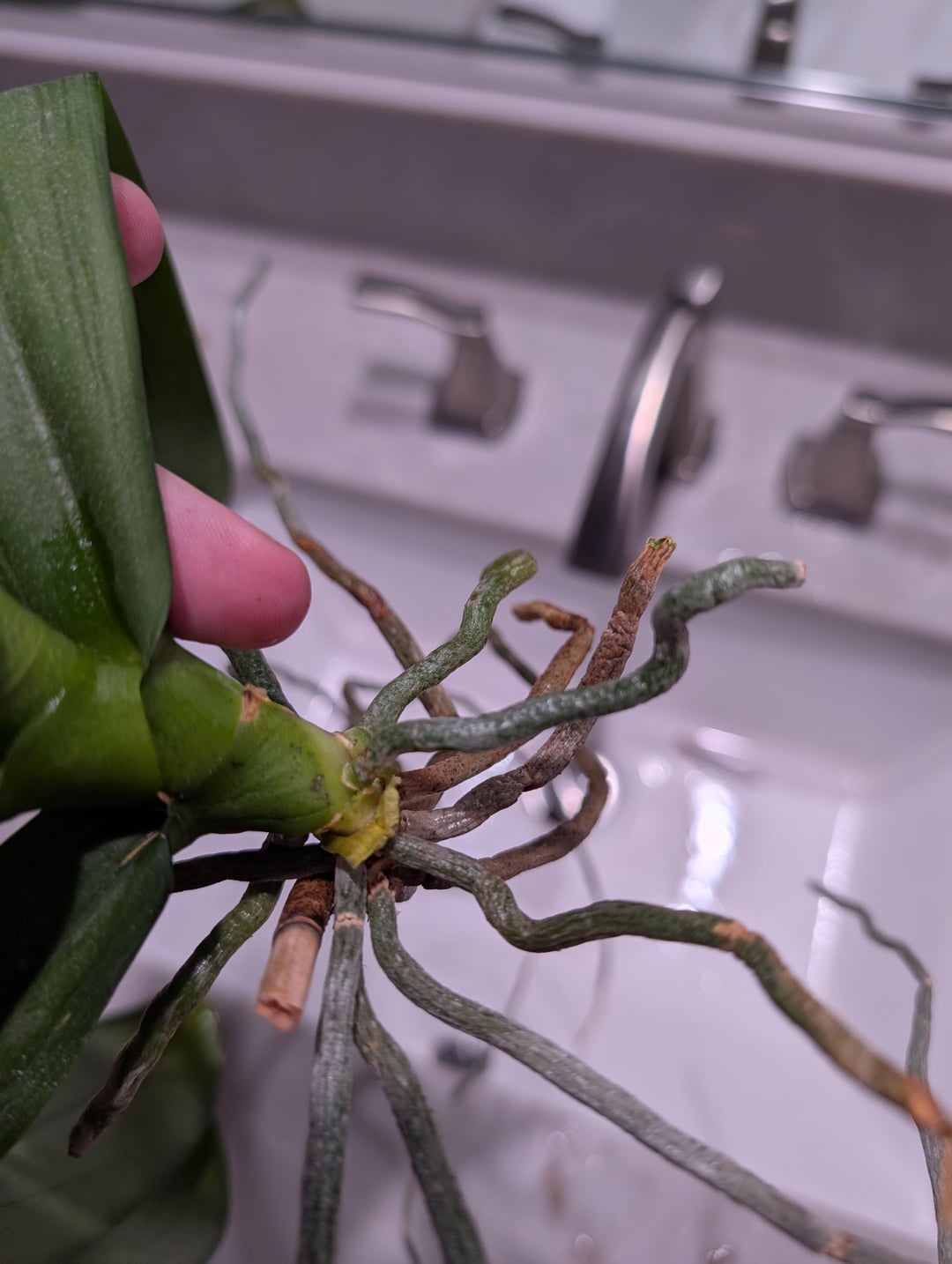 Do this when the membrane covering the roots is silvery and dry. Hydrated roots are green, plump, and mottled. Cut off roots that don’t plump up after watering and roots that are black and slimy. Keep the plant in bright indirect light.