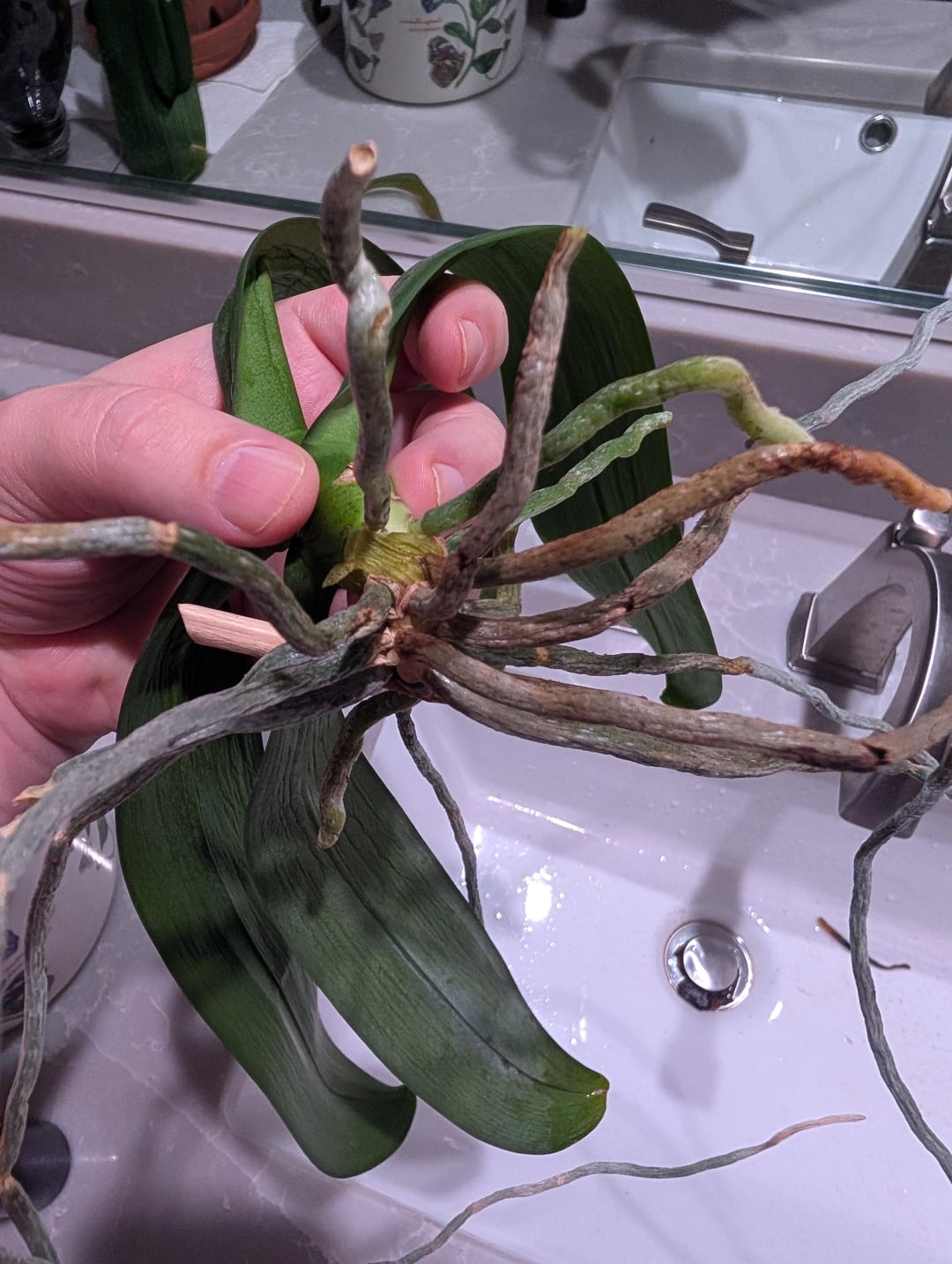 If that’s not the case, I would put this in orchid soil and put a clear plastic bag over the whole plant. Mist every few days. Bonus if you have a humidity reader you can put in there too, keep above 55%.