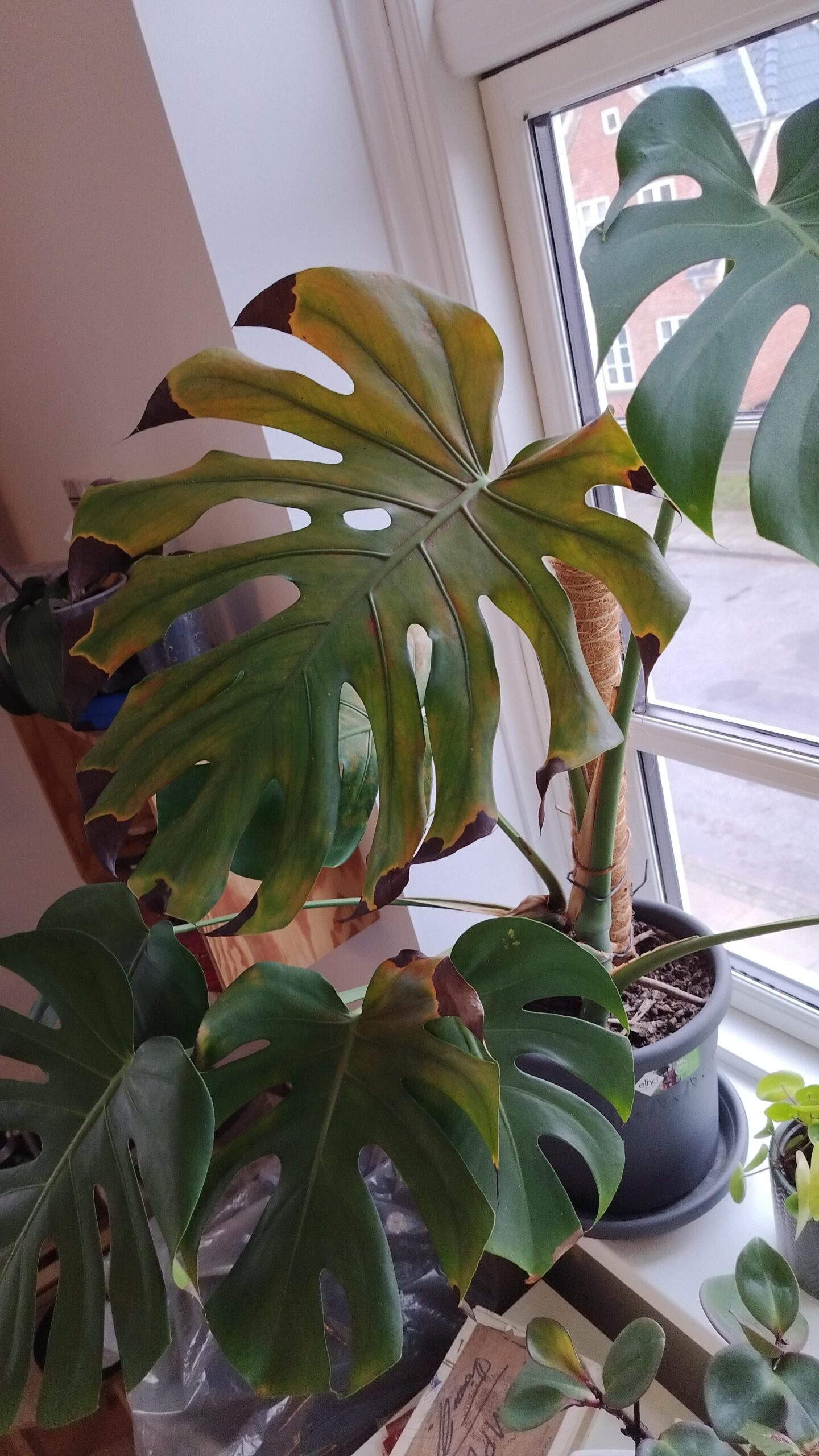 Some of my mosteras leaves have been slowly turning yellow, and dying in the edges. It was otherwise doing great after a big repotting. Now a couple of months ago I did spot what looked like an infestation of small yellow mites, but I am fairly certain that I killed them with alcohol, and they have not been reappearing. It does look like it has stopped yellowing, but I'm still not sure, and would hate to loose all this progress. I suspect maybe it needs a report, or I under fertilizer in back in summertime. I water when the soil is completely dry, and it is in a north facing window in Denmark. So not the most sunlight but that hasn't been something it has thrown a tantrum about other years. It also startet yellowing when it was in a west facing window