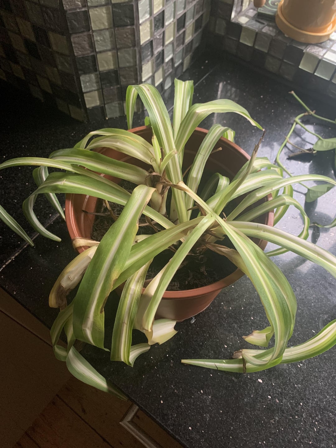 It’s not normally sat on a windowsill because I know spider plants don’t need a ton of light, but I did leave it there over Christmas while I went to visit my parents. Before I went I trimmed the dead leaves with sterilised scissors and gave it a good water. I’ve come back and it looks the same if not worse.