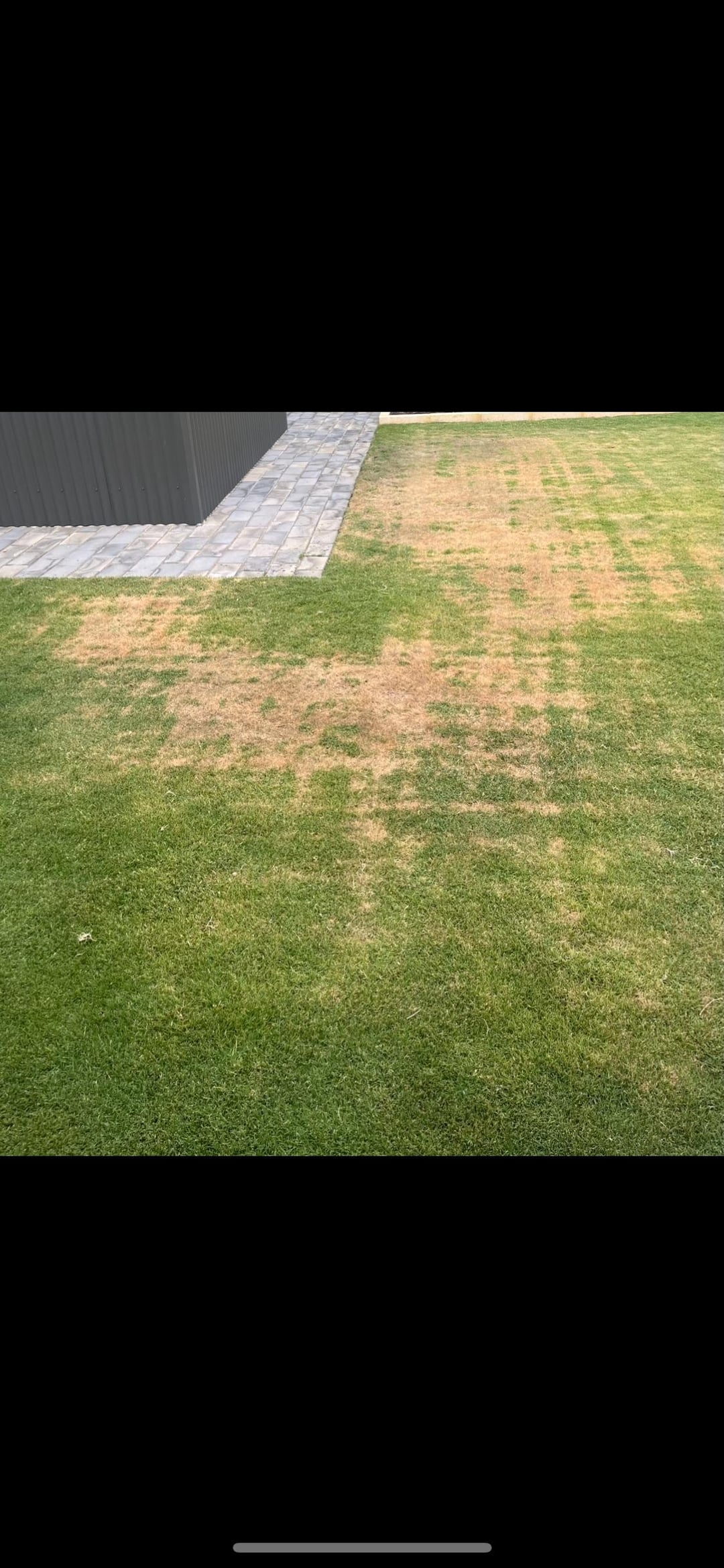 What is the black structure nearby? Is it corrugated meatal of some kind? It’s summer there and hot I presume. I would guess that structure is reflecting heat and scorching the lawn. I have seen similar issues here where reflective windows cause these very odd straight streaking lines. Took us a long time to figure out that was causing it. How we found out, It actually melted a big hole lacrosse toss back net thing. Folks were like wtf is is the random hole in the net? We put our hands over where the hole was and could feel the heat being reflected back. I have also seen similar with fences