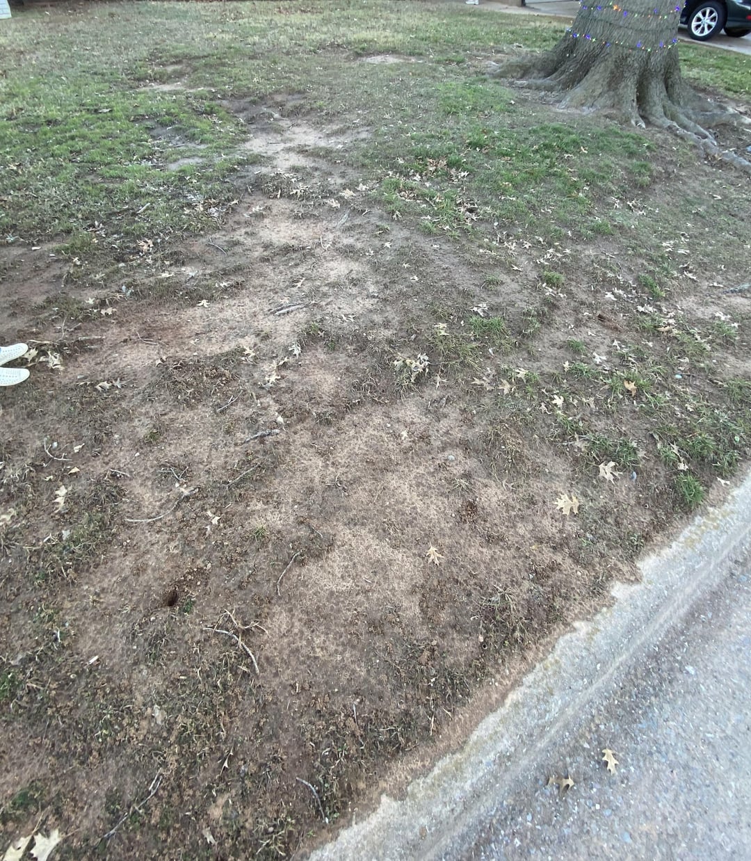 Purchased our house with the yard in this condition. Yard is sandy, but more sand concentrated towards the street. Large oak tree with exposed roots and the water meter near it make me hesitant to build a retaining wall around the tree. Thought about tilling, adding soil, and laying sod but unsure about the slope of the yard washing it out. The sand patch runs from my yard into the neighbors yard as well. Any advice or wisdom would be greatly appreciated 🙏🏼