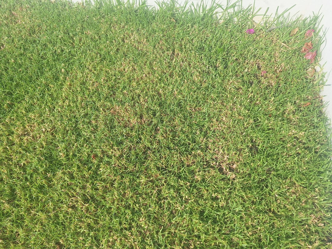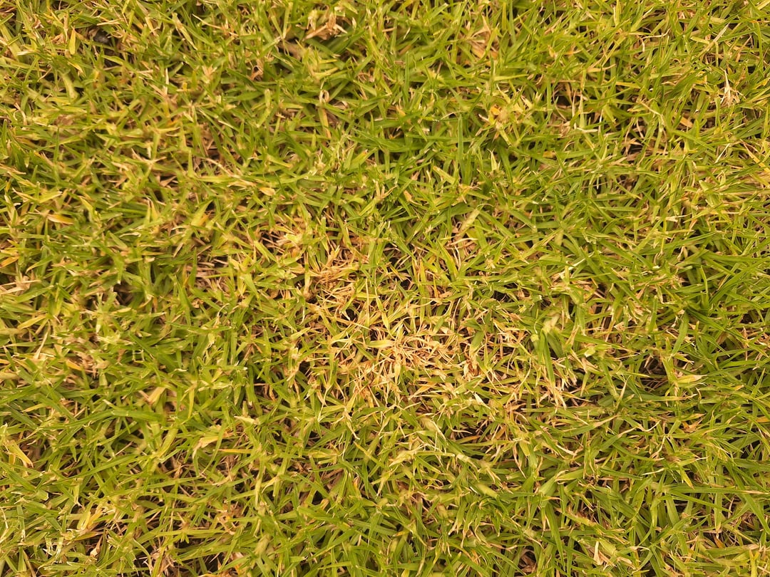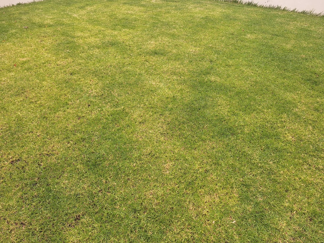 The lawn was laid 6 months ago and I've been struggling to keep it lush across the whole area. I believe it's Kikuyu. Ive been watering twice per week (about 40mins per session at dusk or dawn until the ground is sopping), applying lawn fertilizer once per month, and it sees very little traffic. Certain spots are beautiful and lush, and will explode with grow at 10cm in a week. While other areas are yellow with some thatching (I think?) and grows very very slowly if at all.