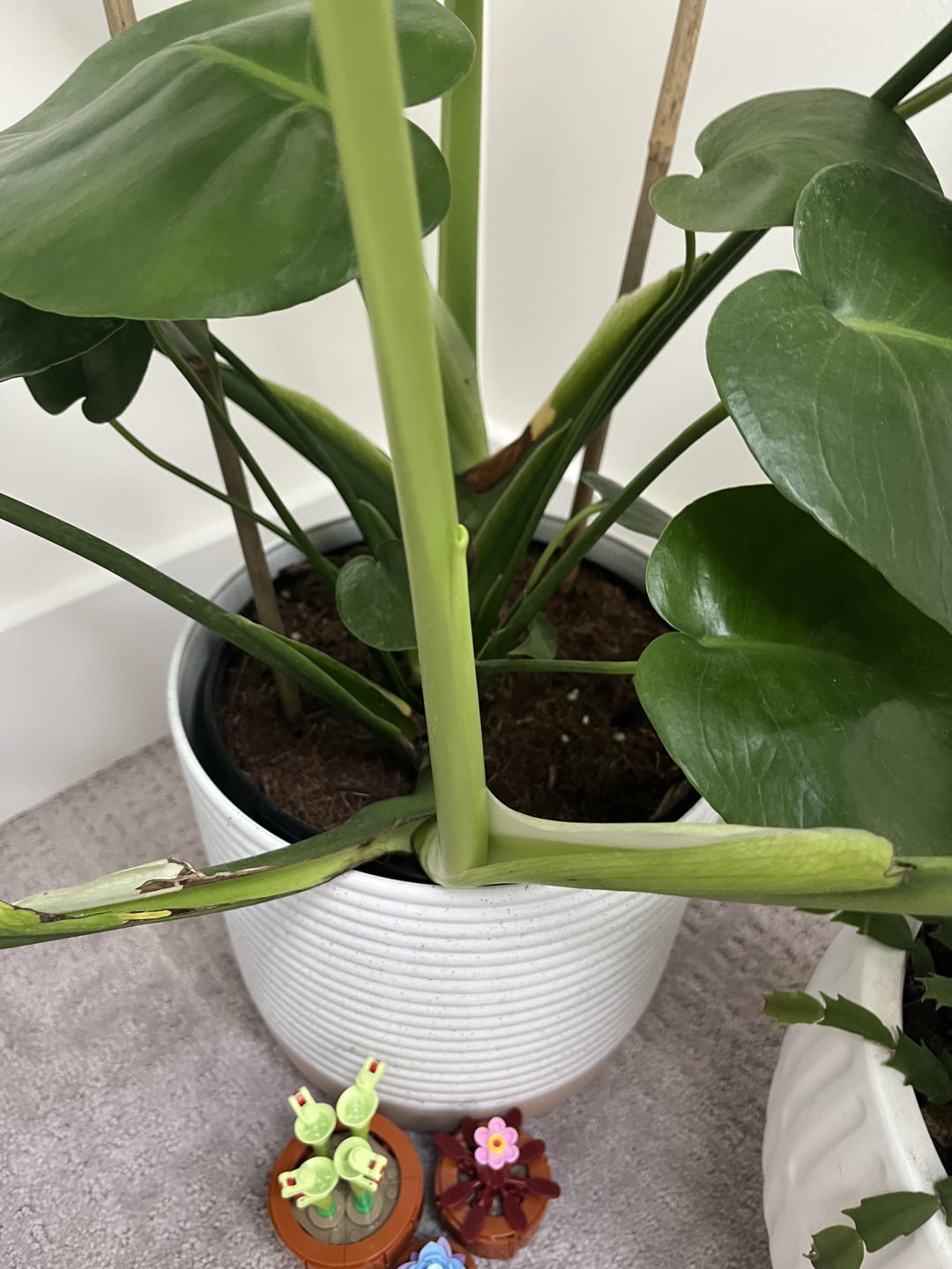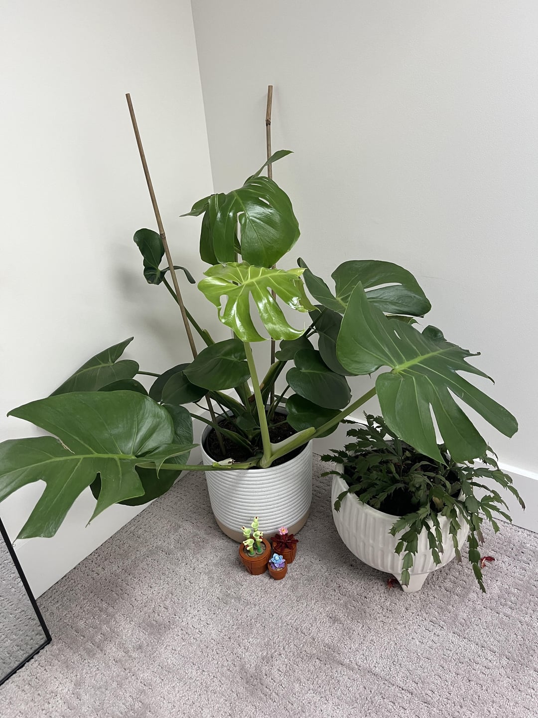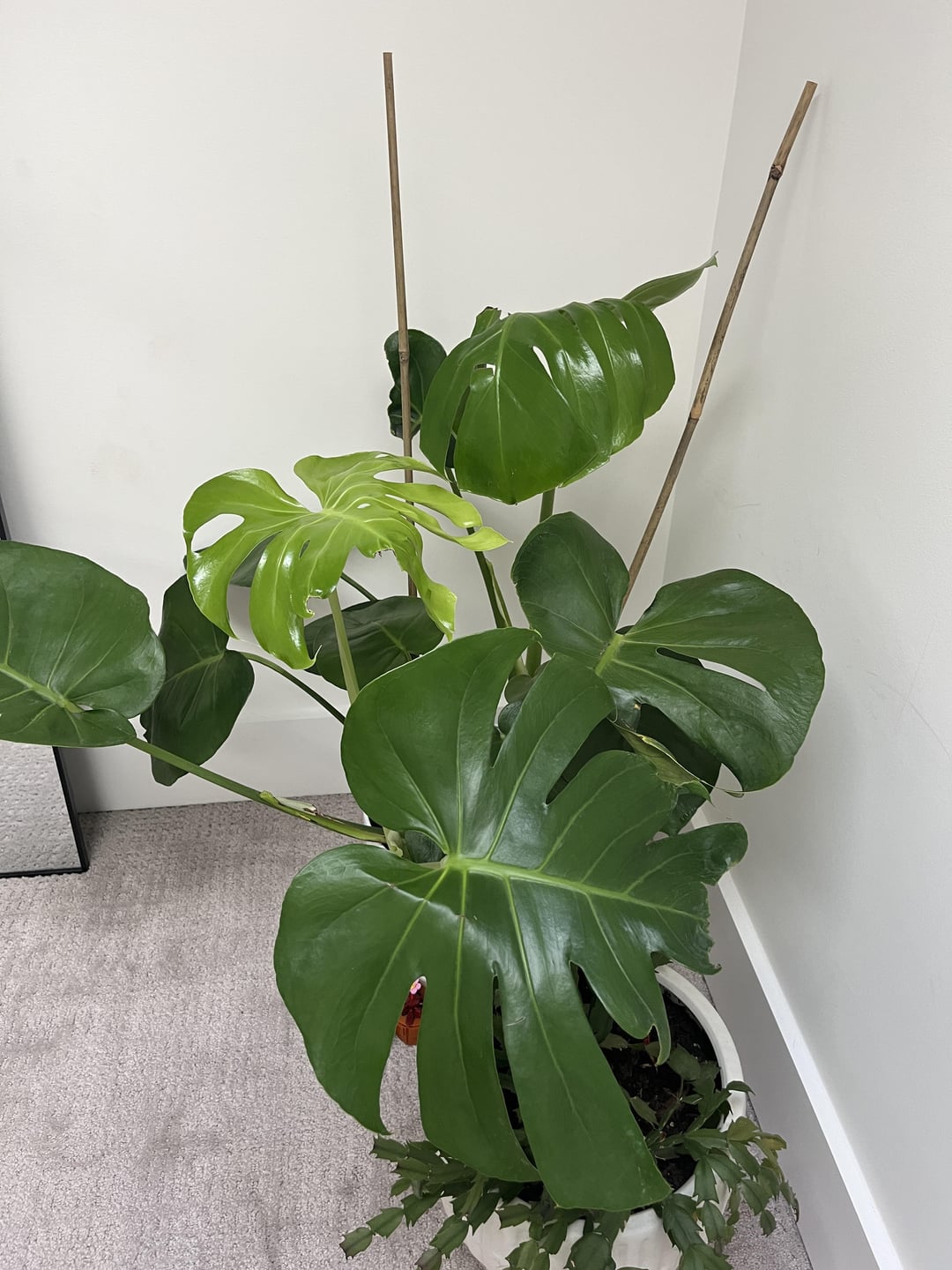 It won’t be getting enough light if it’s not by a window imo! Water when the soil is pretty dry, just poke your finger as far in as possible and see how it feels, they can tolerate under watering quite a bit so better leave it a few more days if you’re unsure! It will grow towards the light so unfortunately the wooden stakes will need to be facing you, and leaves facing the window or it’ll start turning around! Moss poles are better for support