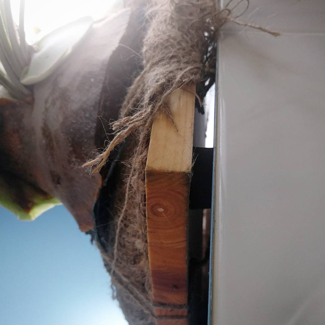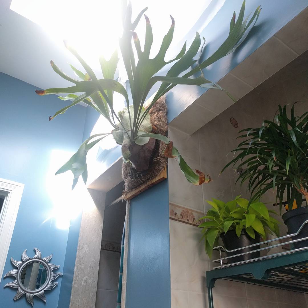 #whatshanginwednesday – here are some details on how I hang my staghorn fern: (📷 1) right under the skylight is why this plant has been successful; (📷 2) I glued small pieces of foam to allow airflow behind the board; (📷 3) these heavy duty picture hangers are rated for 50 lbs