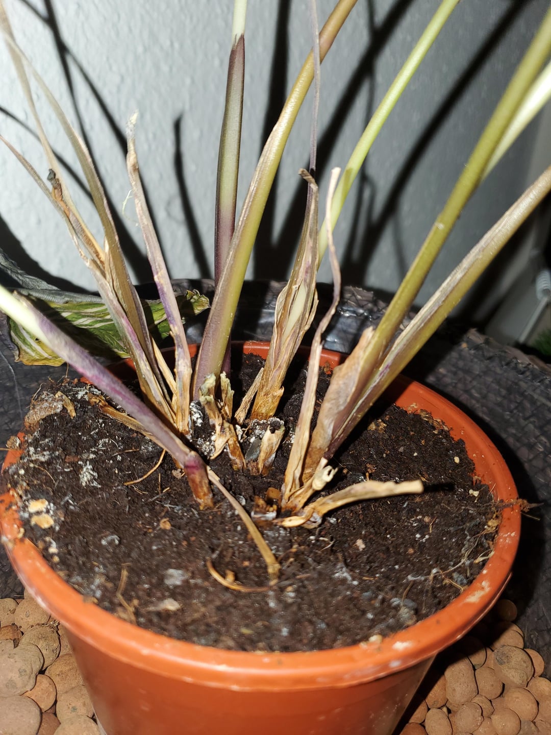 You don’t want to water on a schedule, water when the plant needs it. Check the roots for rot. You may be able to trim the rot, remove the dead leaves and stems and repot in new soil. I do a coir, perlite, sphagnum mix.