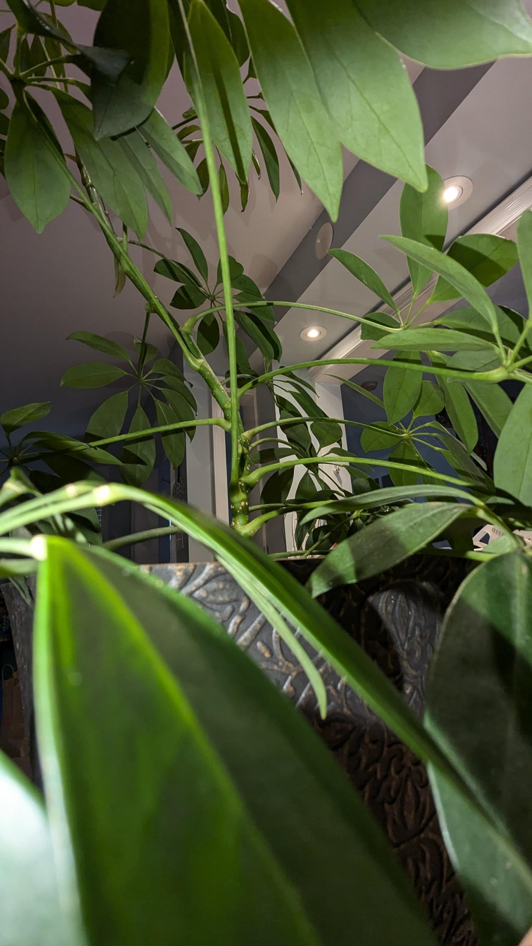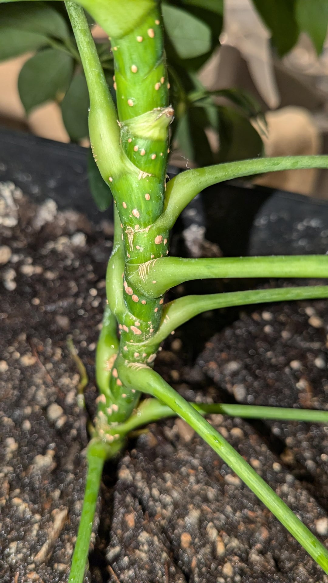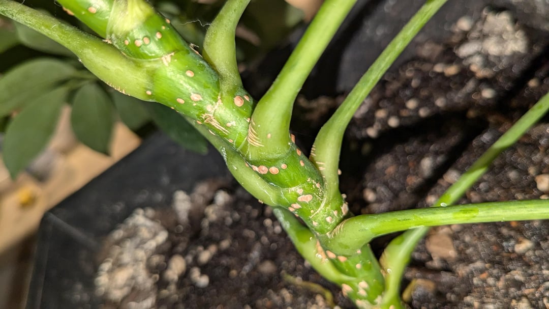 I was gifted this umbrella plant around Thanksgiving and didn't notice any pests or this on the stem at the time. Is scale? What can I do to get rid of it if so?