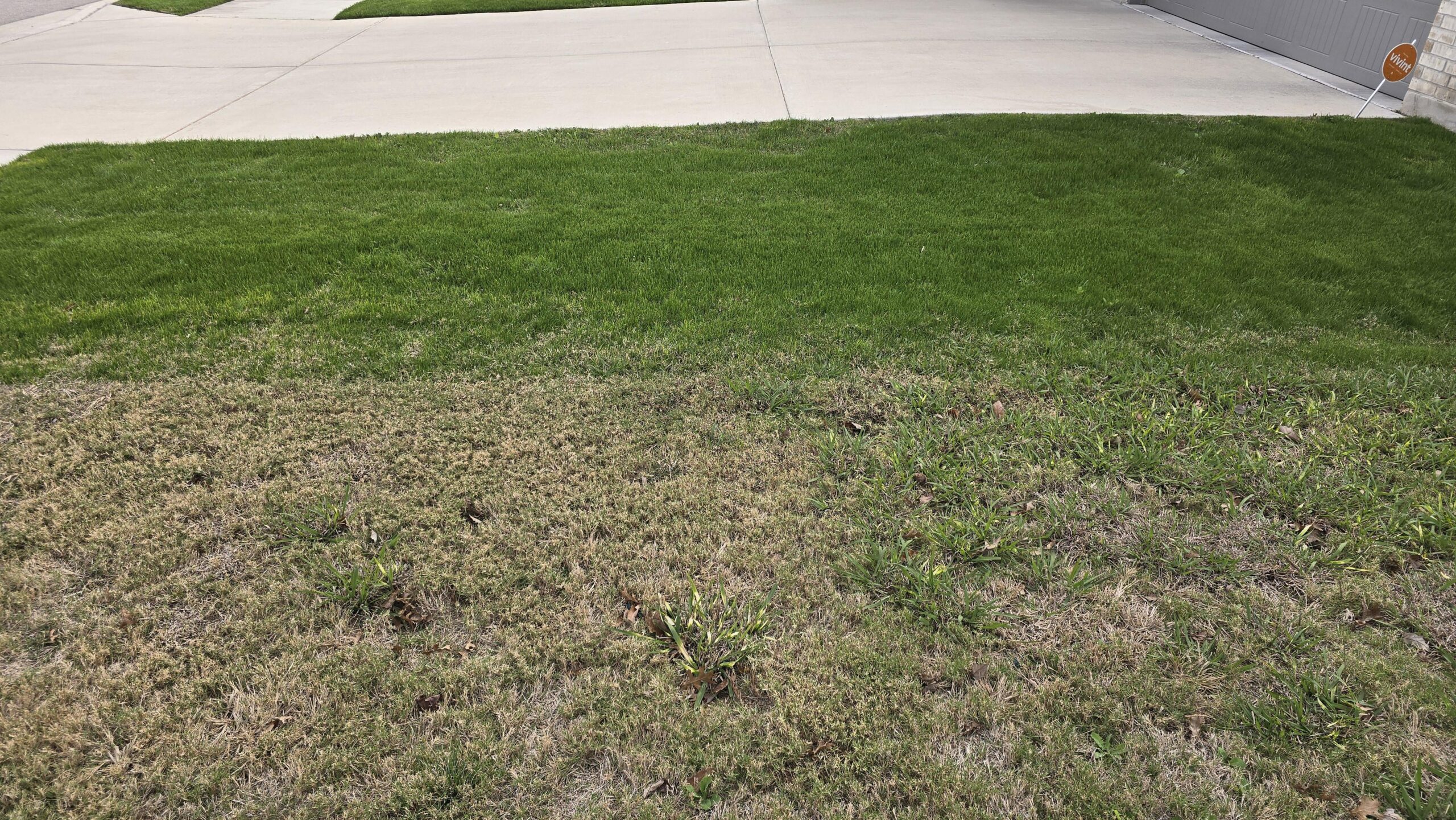It’s the dead of winter right now, and your Bermuda grass has gone dormant. It’s going to look that way until about mid April. Starting about the second weekend in April, start fertilizing once a month. Your lawn will come roaring back