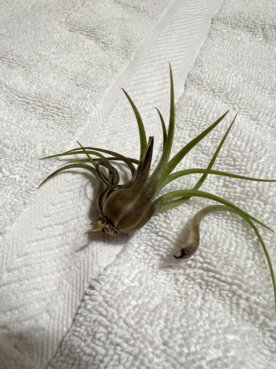 Bulbous tillandsia are prone to rot because water will stuck in the blub, keep only the leaves in water while the bulb outside of water.