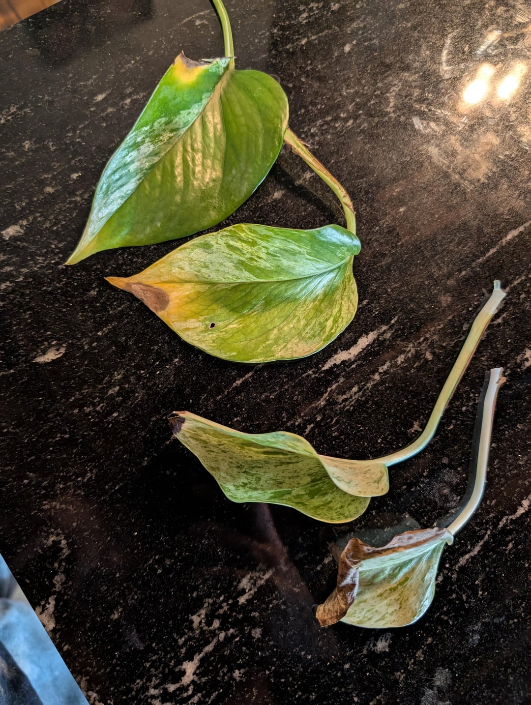 4. I’ve basically given up on most of my pothos. I have found that bottom watering after I notice the leaves drooping seemed to help, but they all still lose some leaves here and there. I’ve abandoned any schedule for watering, and instead wait for the visible drooping, then bottom water. It has worked reasonably well for my Marble queen and N Joy. I’m letting the golden just die, though. I seem to only be able to keep those alive in just water instead of soil.