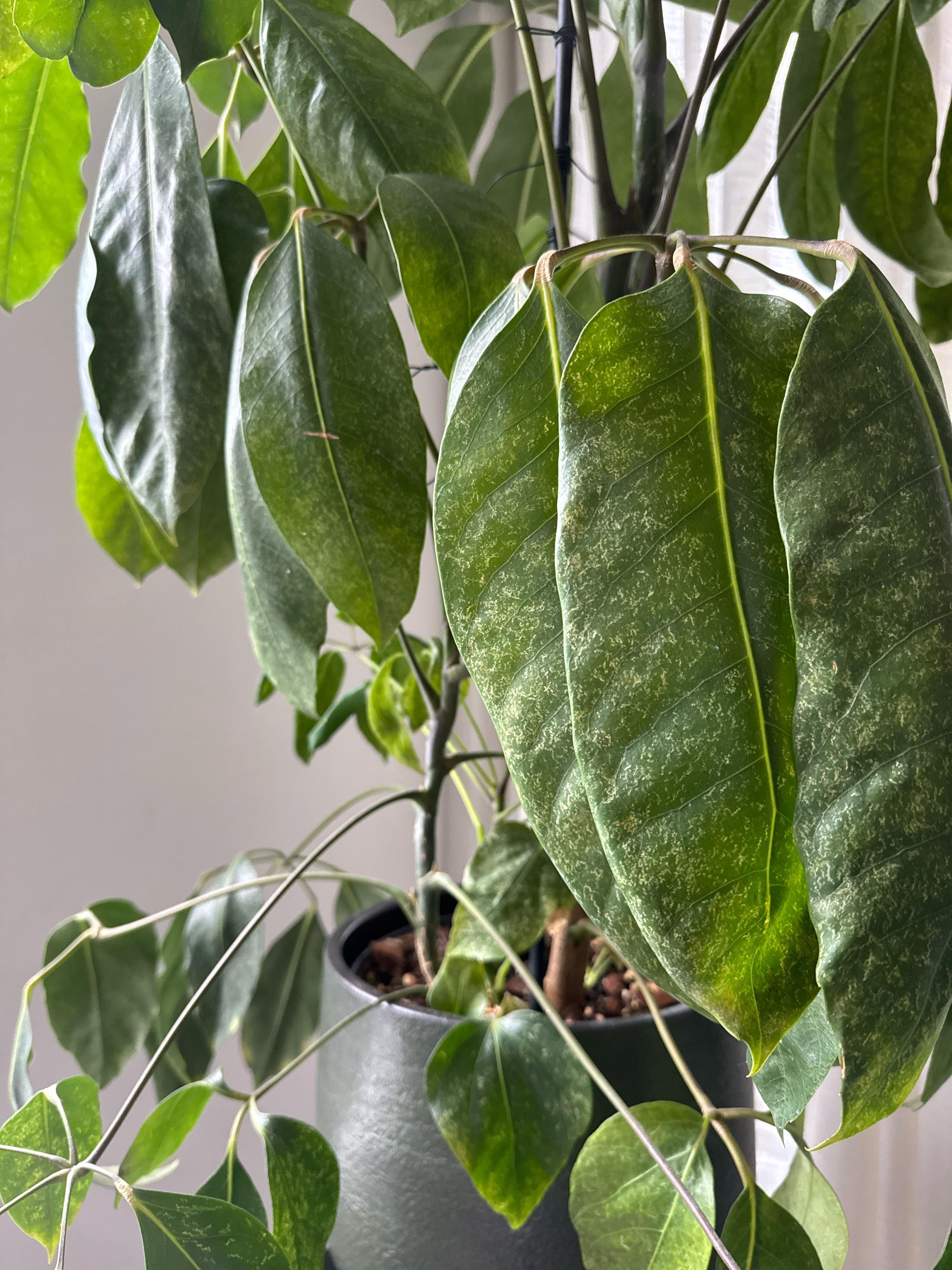 Spidermites left similar marks on my ficus, they are impossibly small to see but you can spot them on the undersides if any are walking around if you look incredibly closely – they’re literally like bits of dust