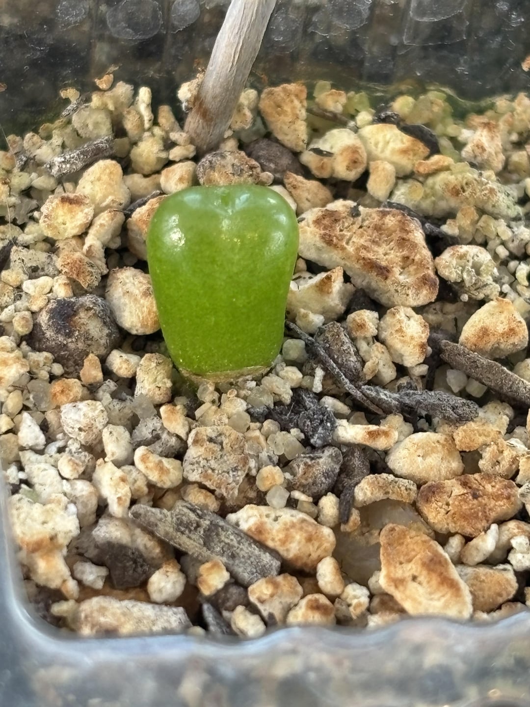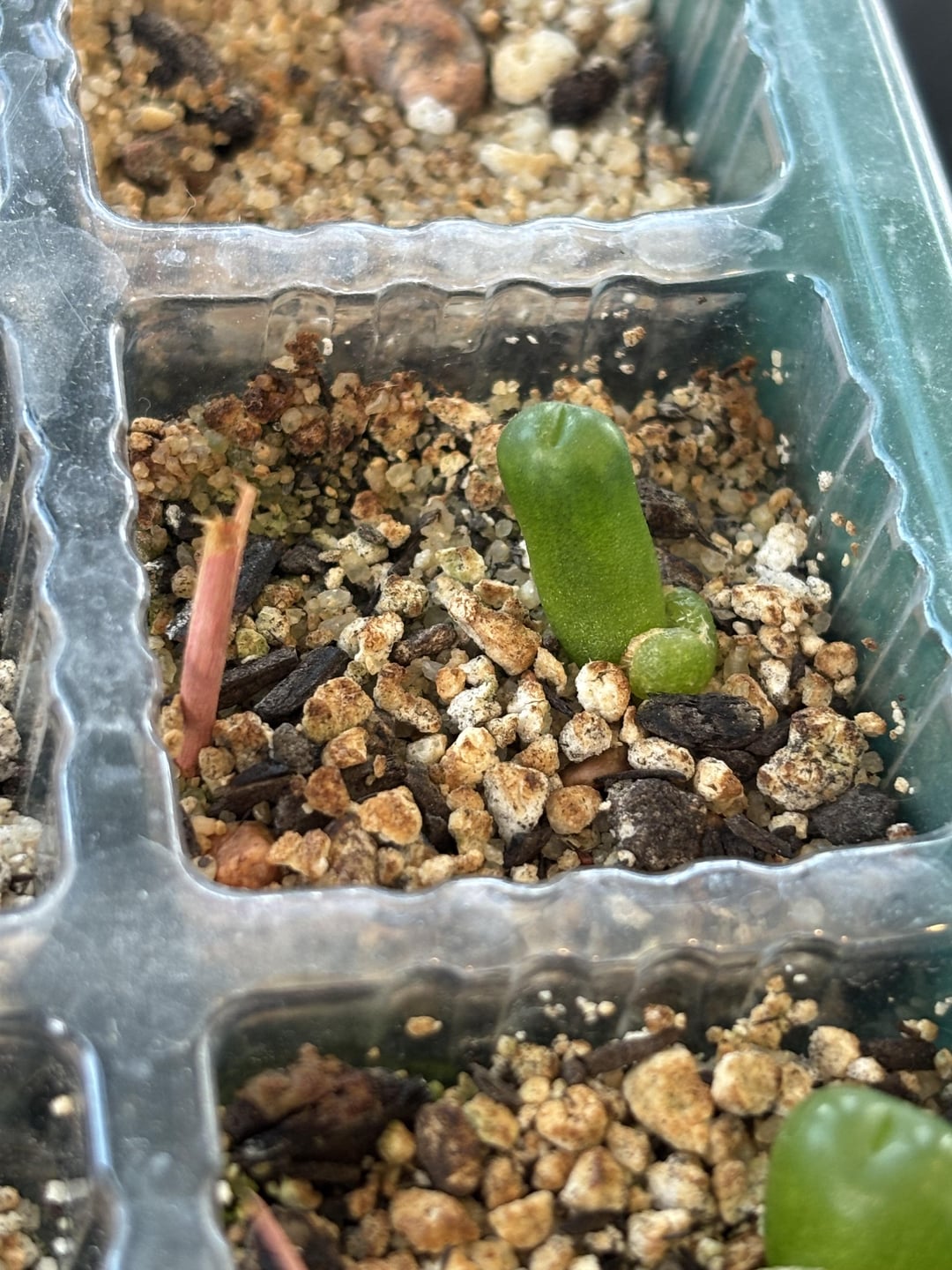 I started some mixed conophytum seeds about 10 months ago. I got very busy and mostly forgot about them since then, but I watered periodically when they seemed to be shrinking. Now some still have the round shell left after they started to get their real shapes.