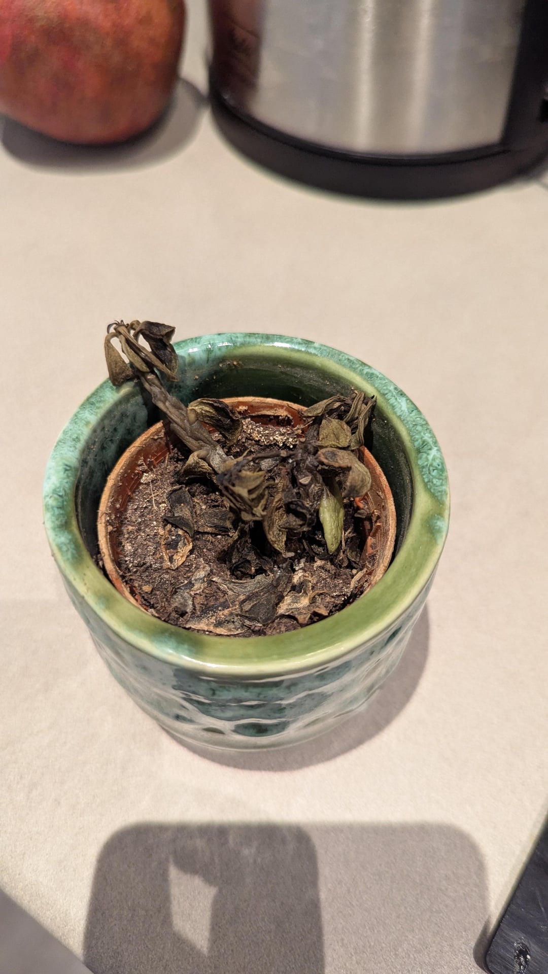 Poor little plant…when you have a plant, much like a pet, when you leave for an extended time period, you make arrangements to have it fed…for pets it’s pet food and water unless they are fish then just food, and for plants, it’s a little sunlight and water. RIP little feller.