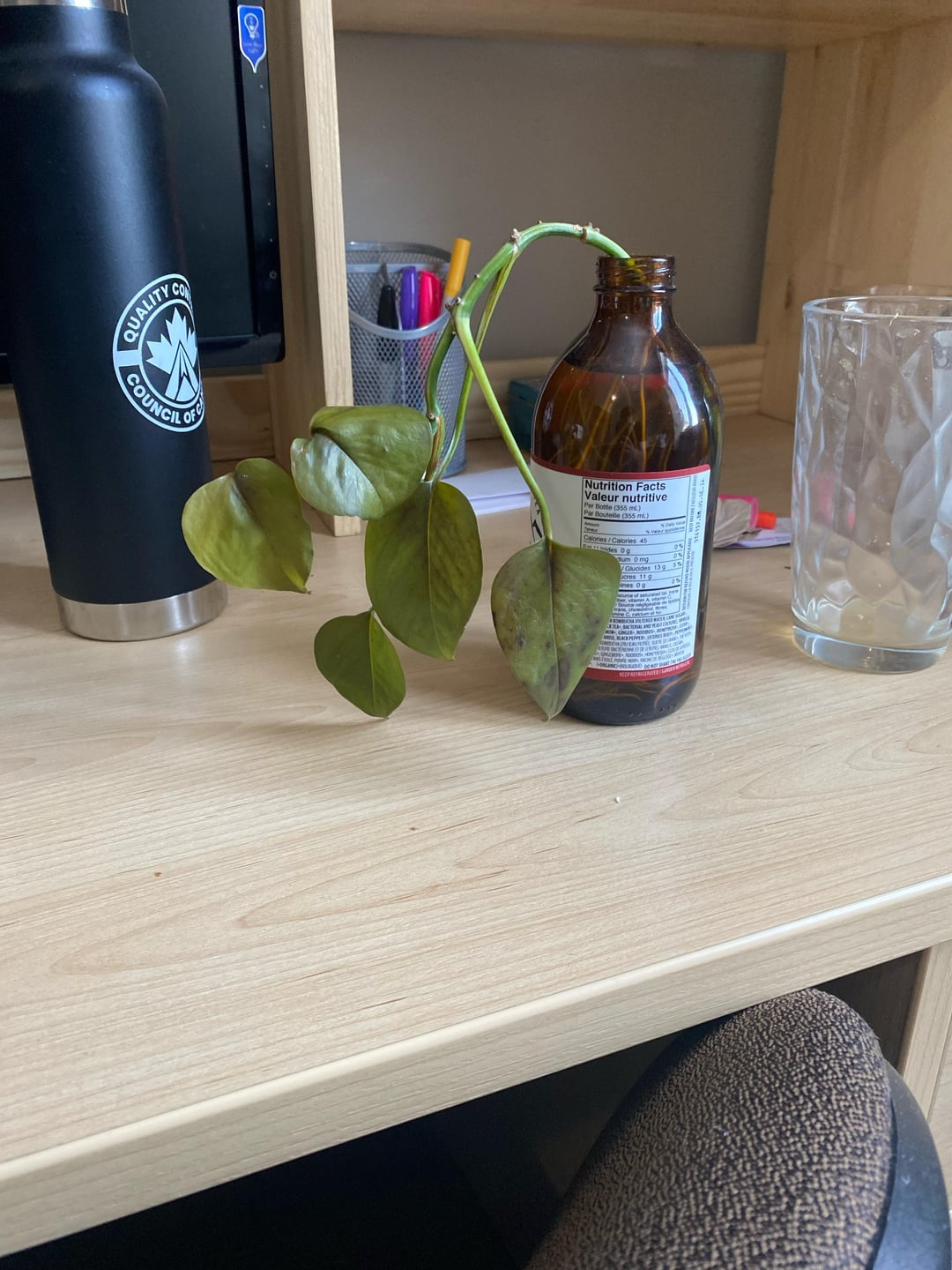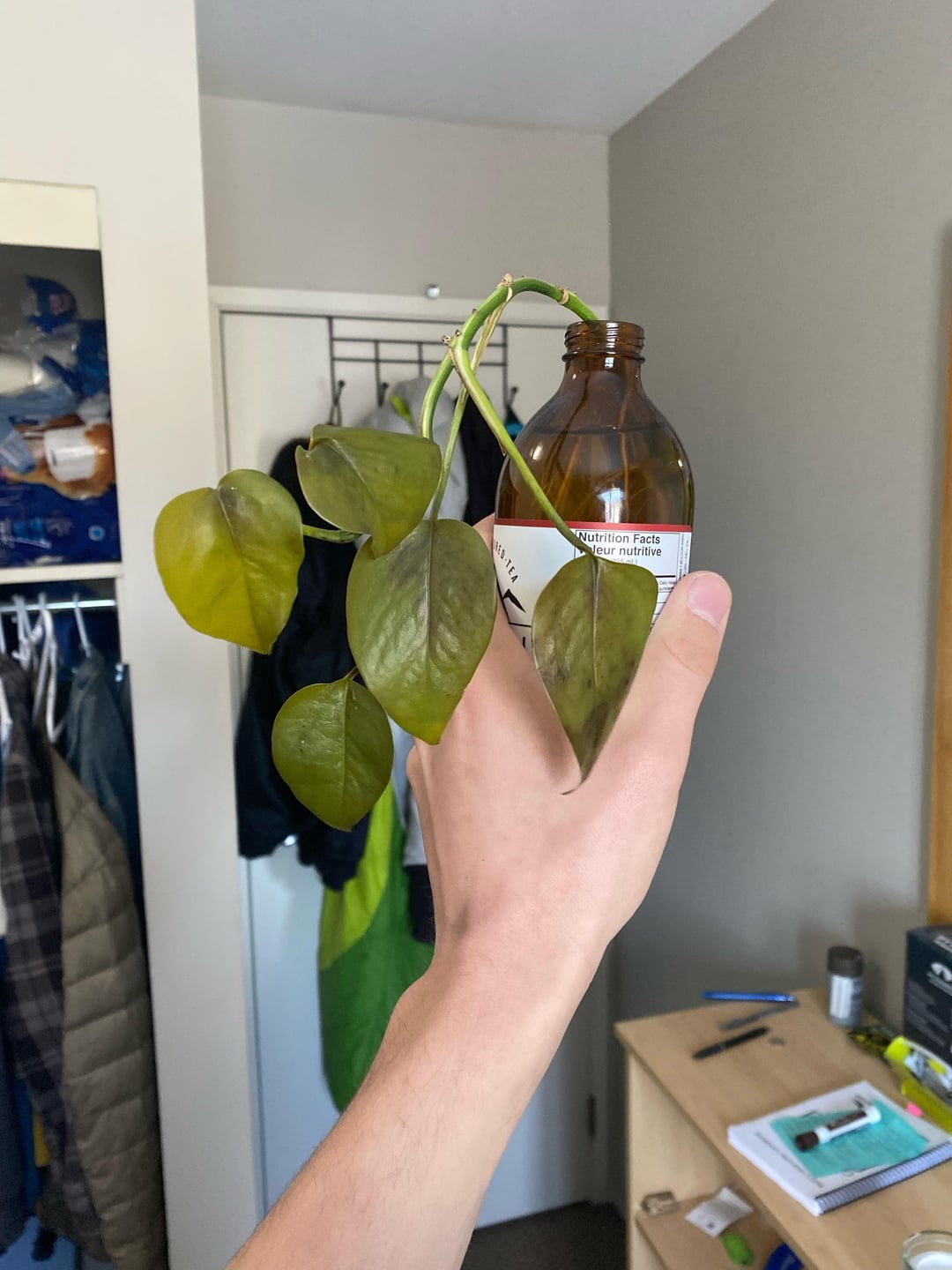 I don’t know what type of plant he is, but it was a propagation a friend gave me. And I don’t know anything about plants. and I’m pretty sure I just leave this thing in water and then just top it up every once in a while and I’ve been leaving it by a window, but not too close so it doesn’t get cold.