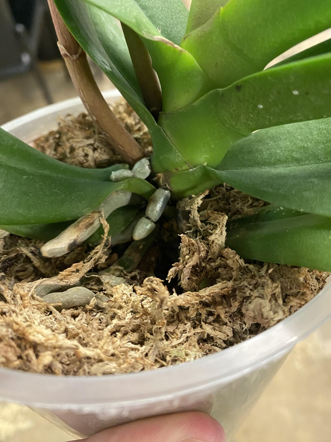 Do this when the membrane covering the roots is silvery and dry. Hydrated roots are green, plump, and mottled. Cut off roots that don’t plump up after watering and roots that are black and slimy. Keep the plant in bright indirect light.