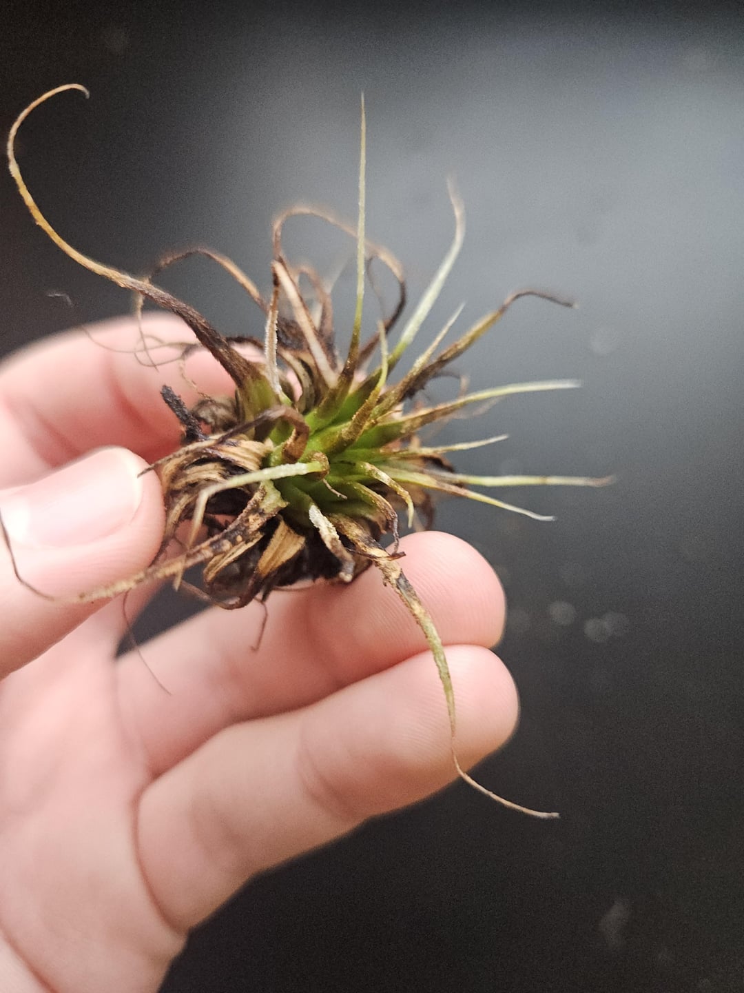 Scared-Departure-696 10 months ago I agree that it looks toasted and underwatered. Soak it once a week and hang upside down to be sure water drains from the crown.