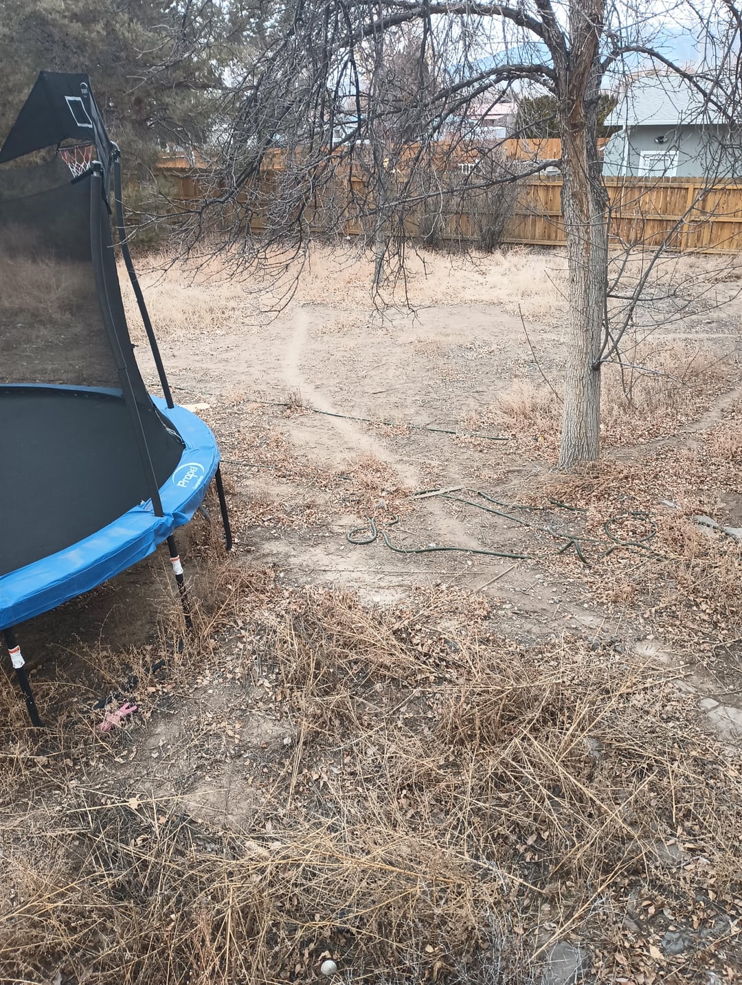 I moved into a house on the border between Colorado and Utah (high desert, generally arid). I've got a back yard that's essentially all dead with these dead weeds all around. There is a ditch water sprinkler system in place that should have full yard coverage, but I won't be able to test it into spring when the water is running again. There is also a lot of old dog poop that I should be able to just shovel up assuming that won't cause problems.