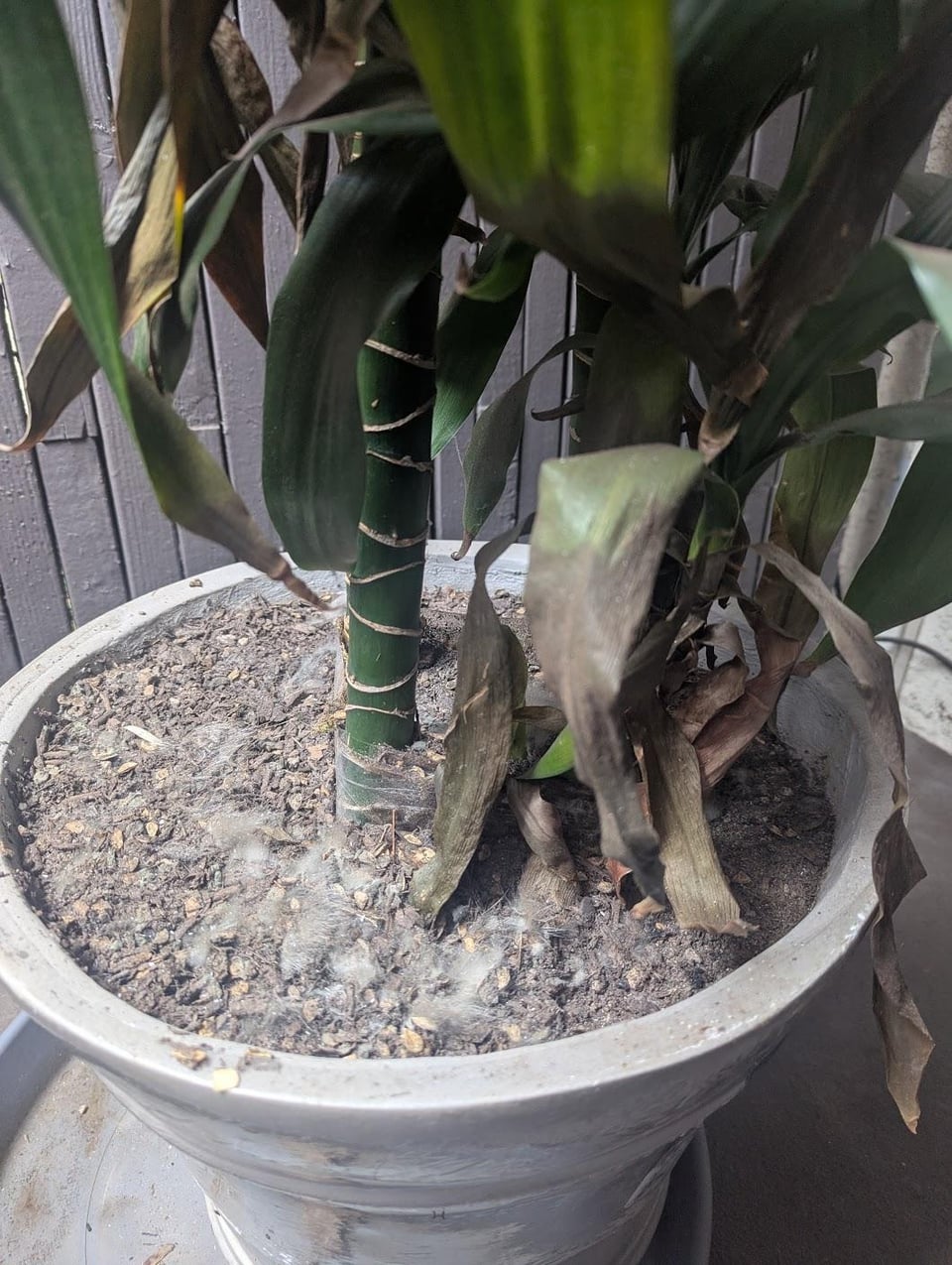 Dracaena fragrans. The soil looks like poor quality and they hate hard tap water. Drought durable but will die from frequent water