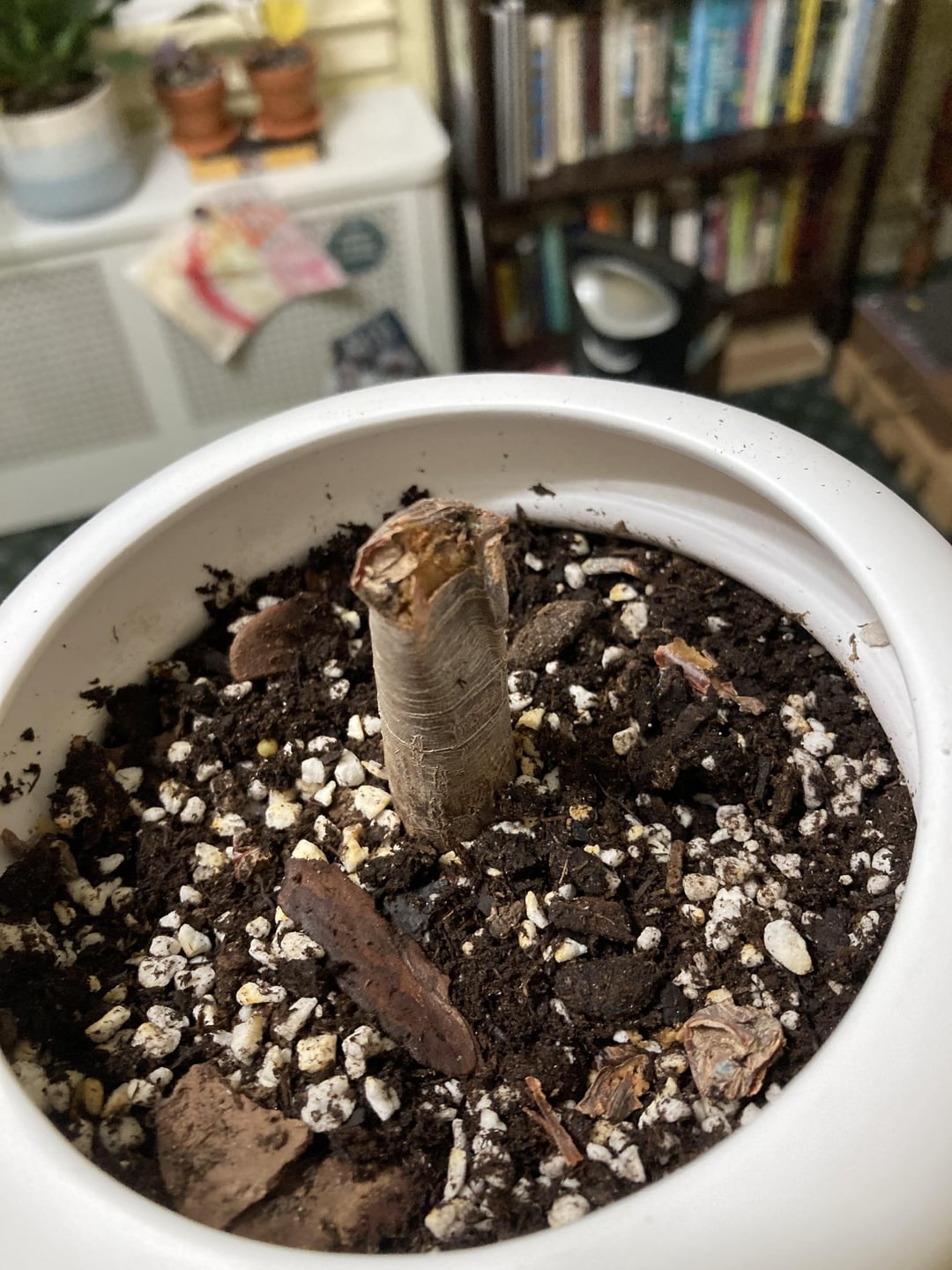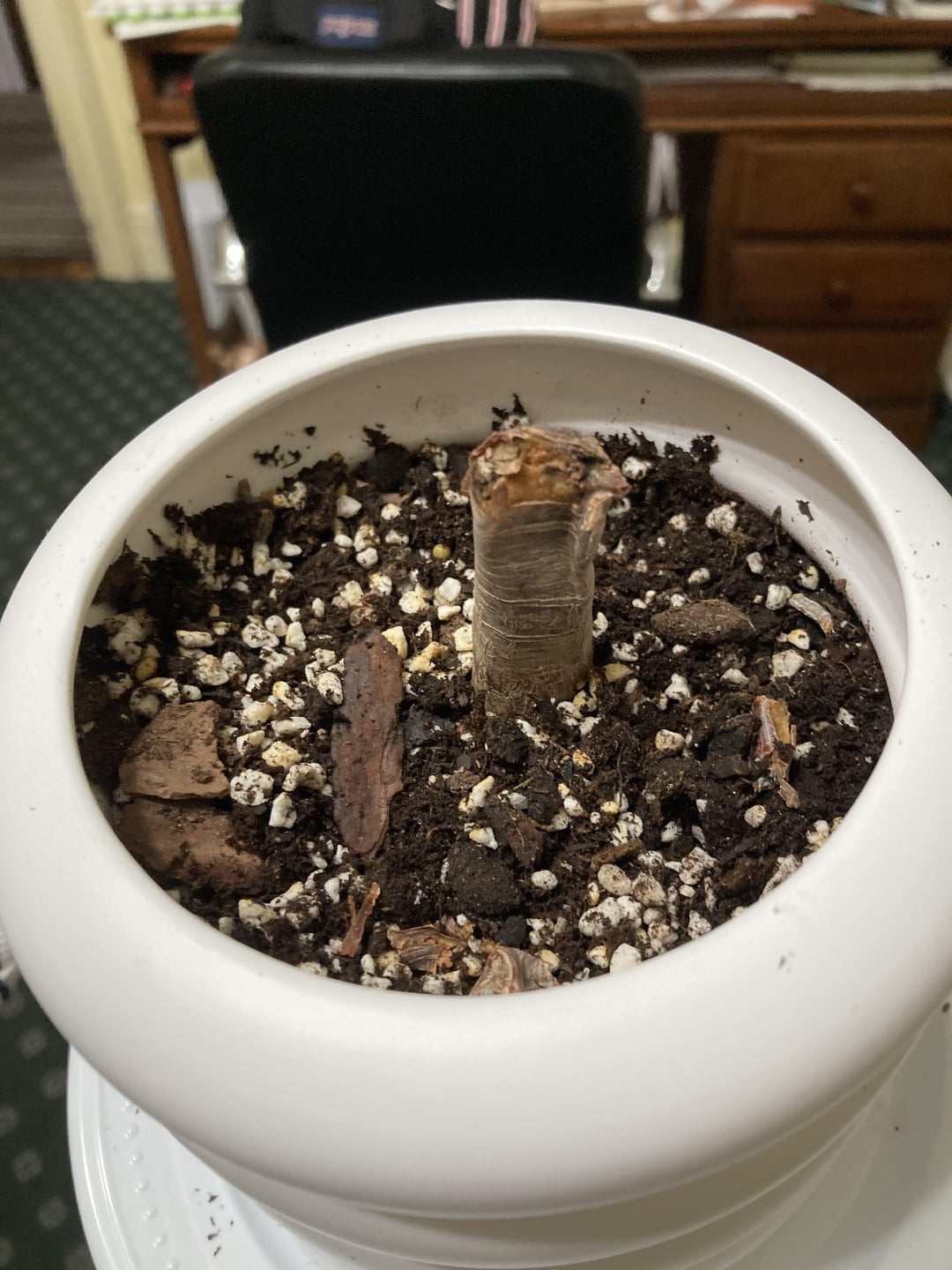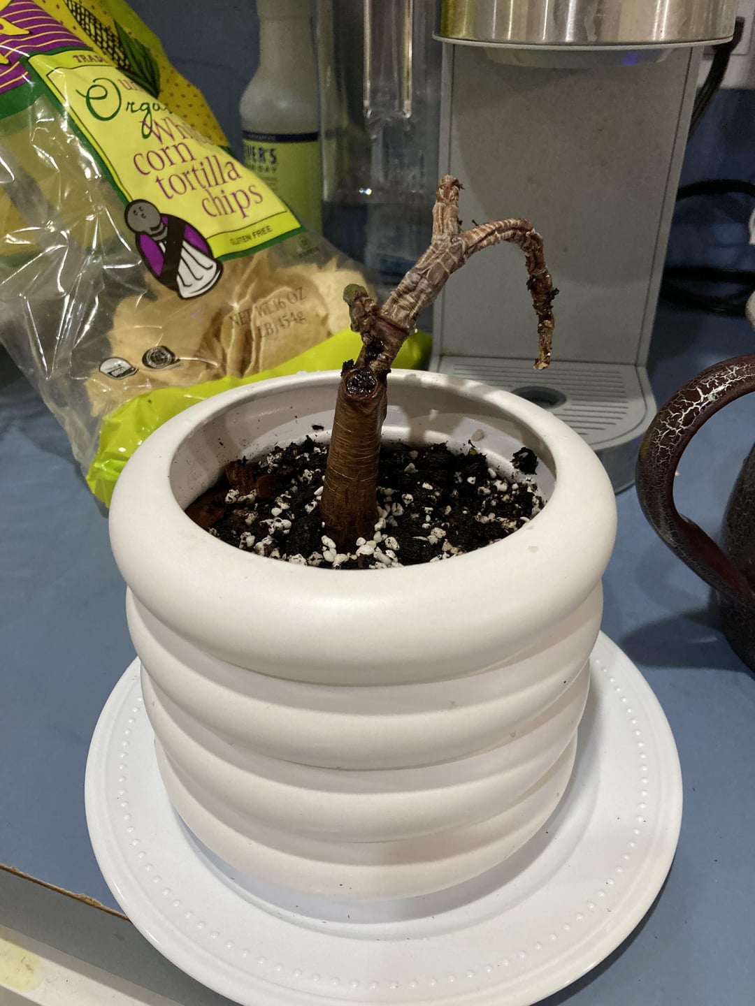 The third picture is how it looked a few weeks ago. The top of the plant has been looking even deader recently, so I cut off the dead branches and the top of the stem. And now I’m left with this (pictures #1-2)