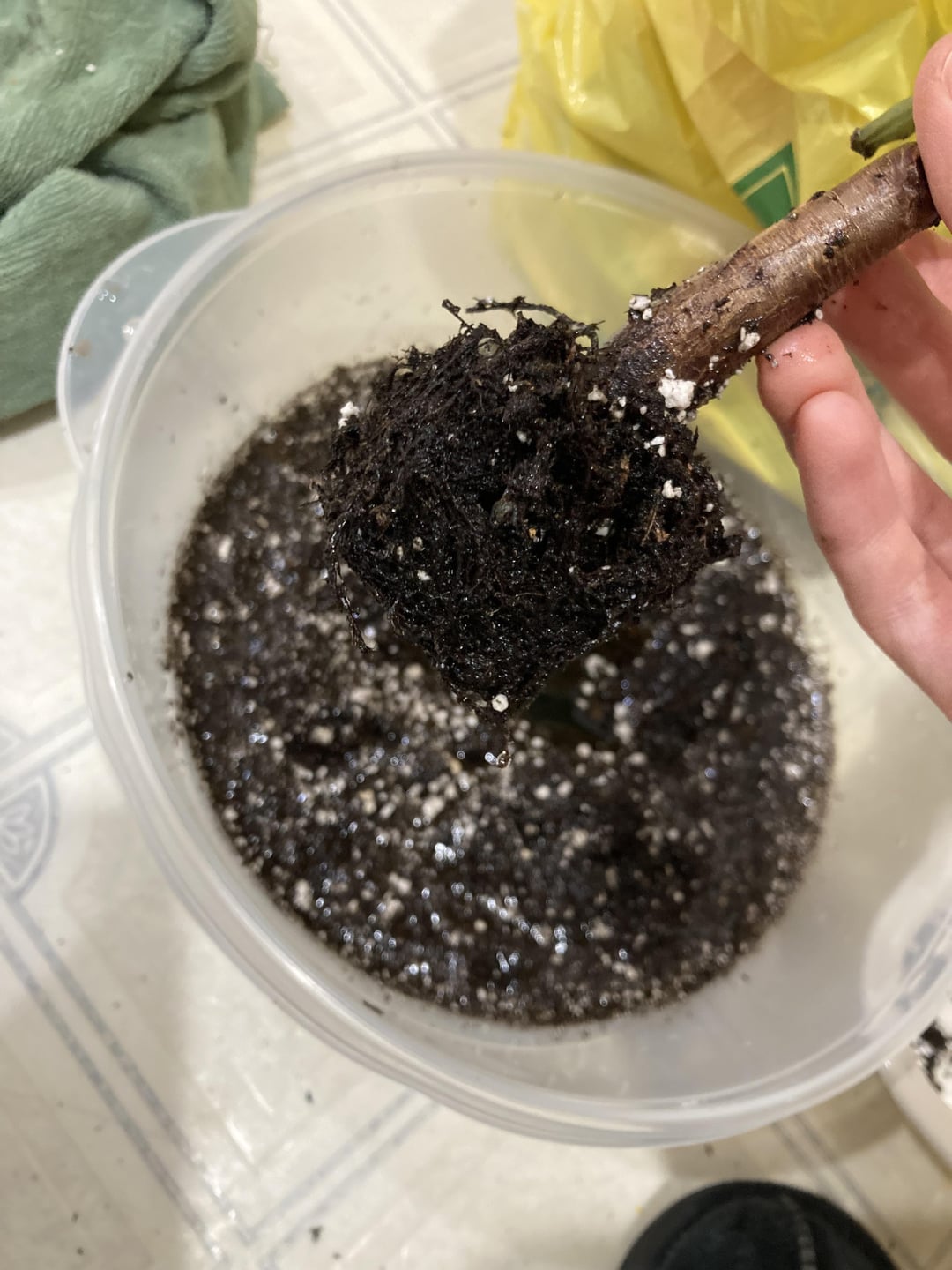 I got a dead-looking jade plant from my partner a few weeks ago. I repotted it and found that the roots looked okay, but were smooshed into a tiny cube. I soaked the root ball to get out some packed-in soil, and tried to spread out the roots using a wooden skewer.