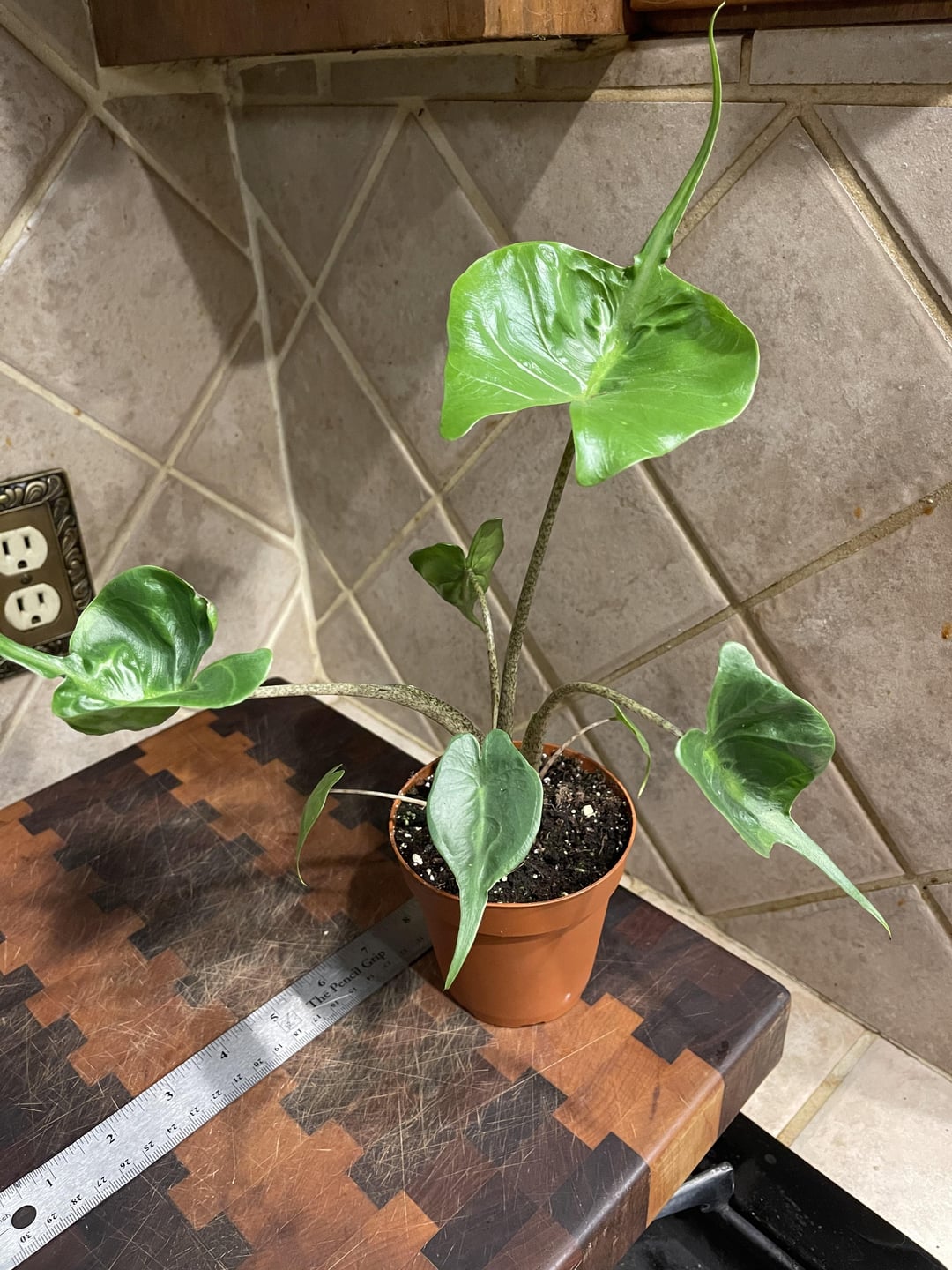 Fully grown, they reach ~3-4ft tall (~2-3ft tall, indoors) vs. 6-8ft+ for the standard A. mac. ‘Sting Ray’.