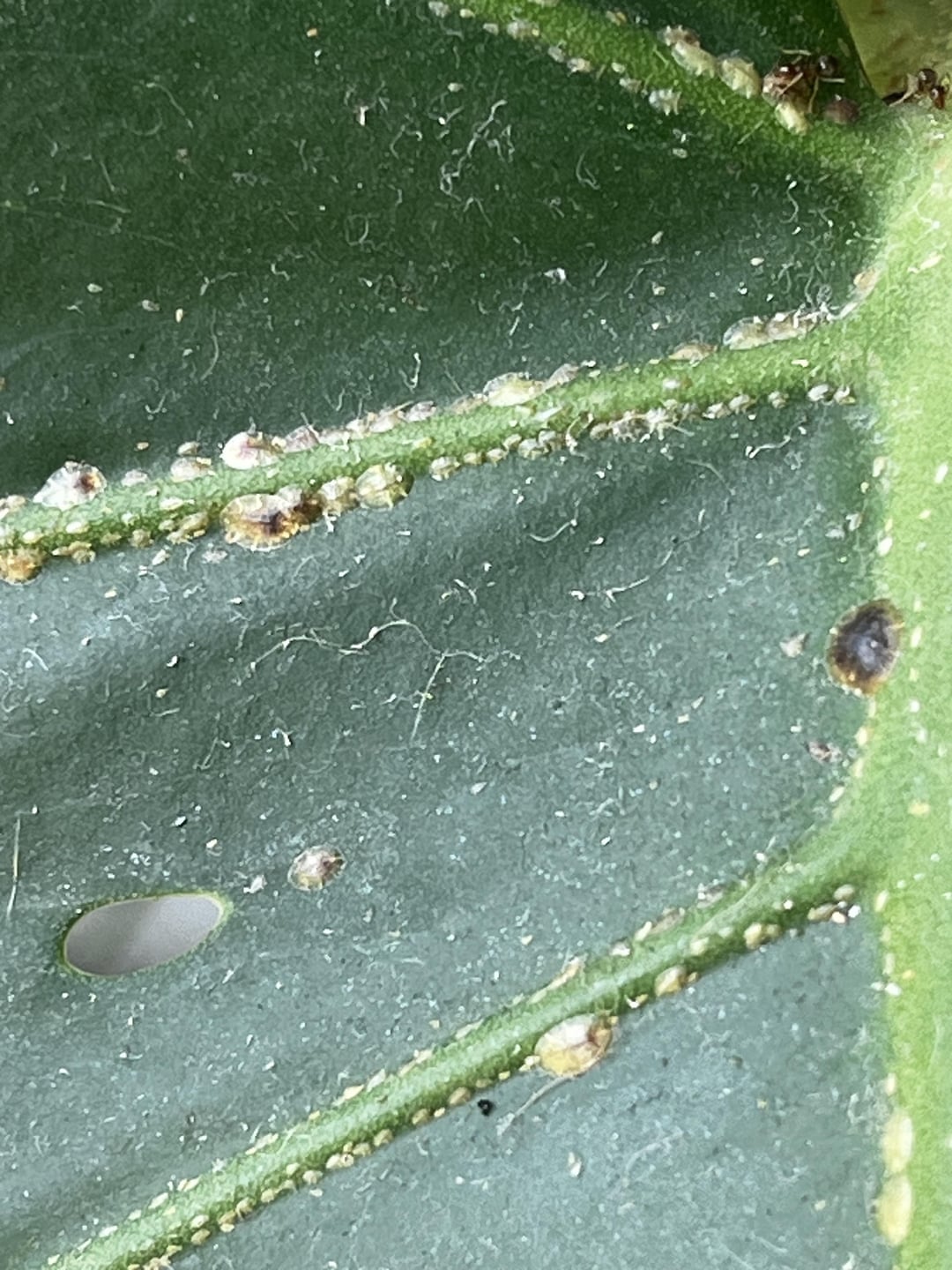 Aphids can produce honeydew which causes stickiness on leaves, and ants farm aphids for their honeydew.