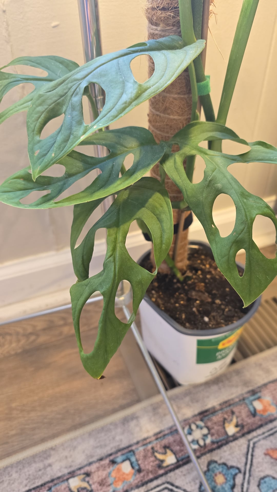 I got her as is, and I've had her over a few months. She has definitely grown, 2 new top leaves, has never been repotted, I added the moss pole and have been attempting to keep it damp to encourage air roots. That's about all I've got. Please let me know what I'm doing right, doing wrong, or what I could be better.