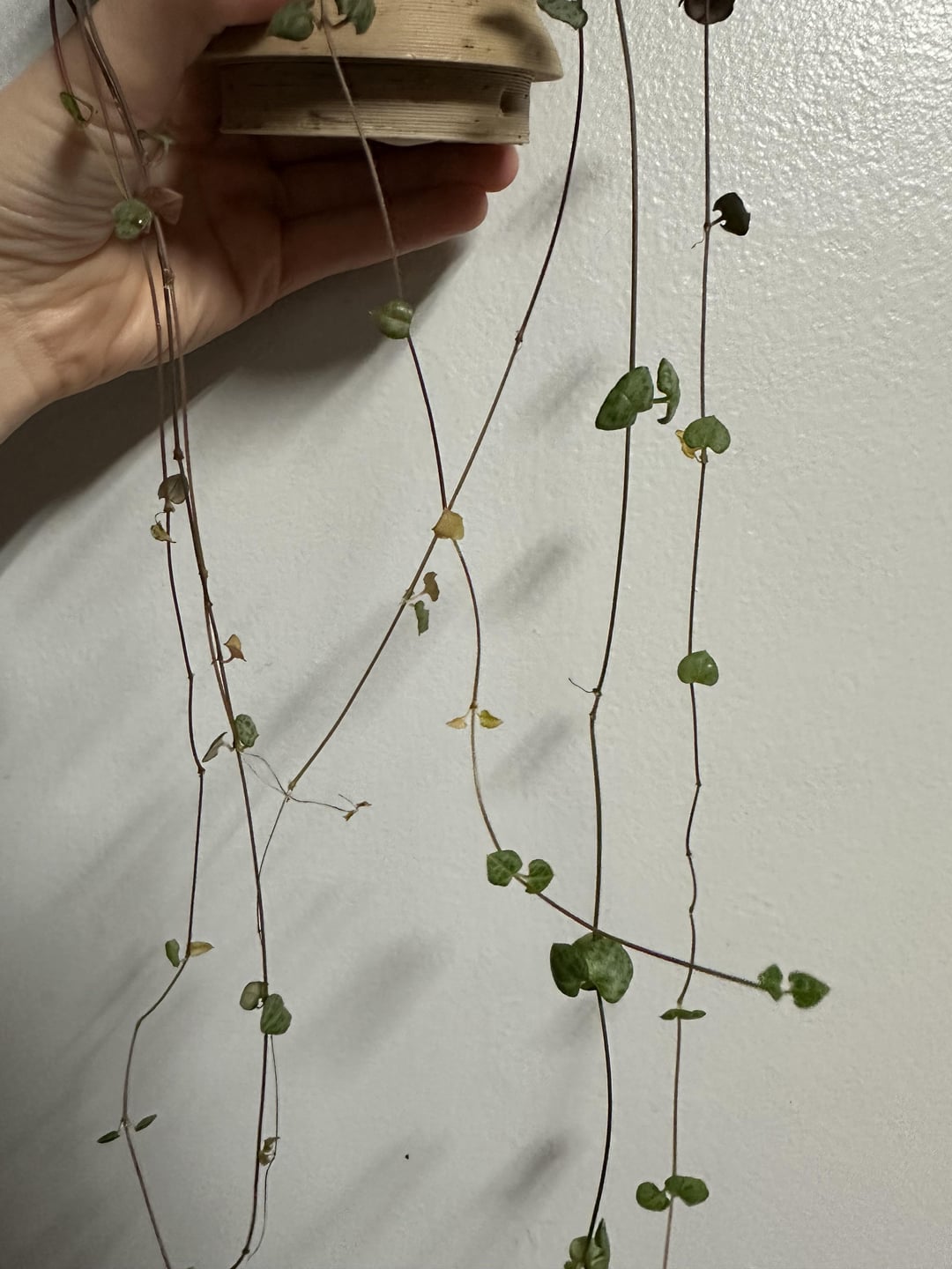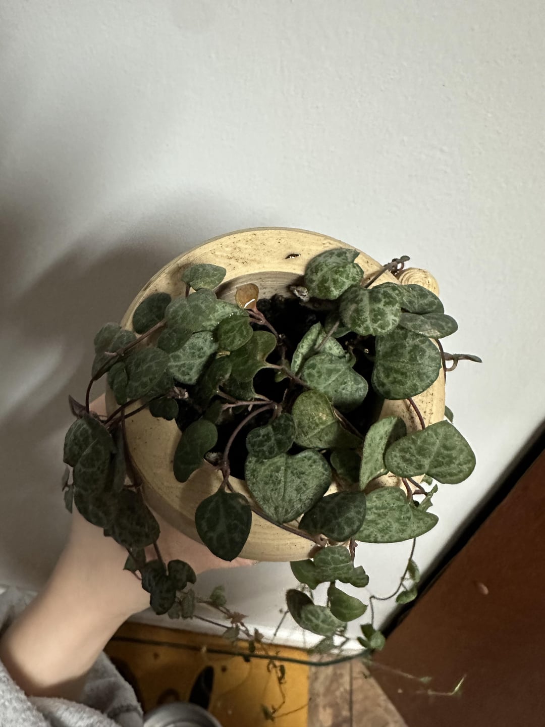 i've had this baby string of hearts for about eight months and i'm wondering if it needs to be repotted. some of the vines have yellowed, but others have yellow spots and then continue to sprout new leaves. i wasn't sure if a larger, wider pot would be better for growth? this is the first time i've ever owned a plant and it hasn't died within the first few weeks, im quite attached to her and want her to thrive. for context, ive been watering about once a month and it stays in a windowsill that gets a lot of direct sunlight.