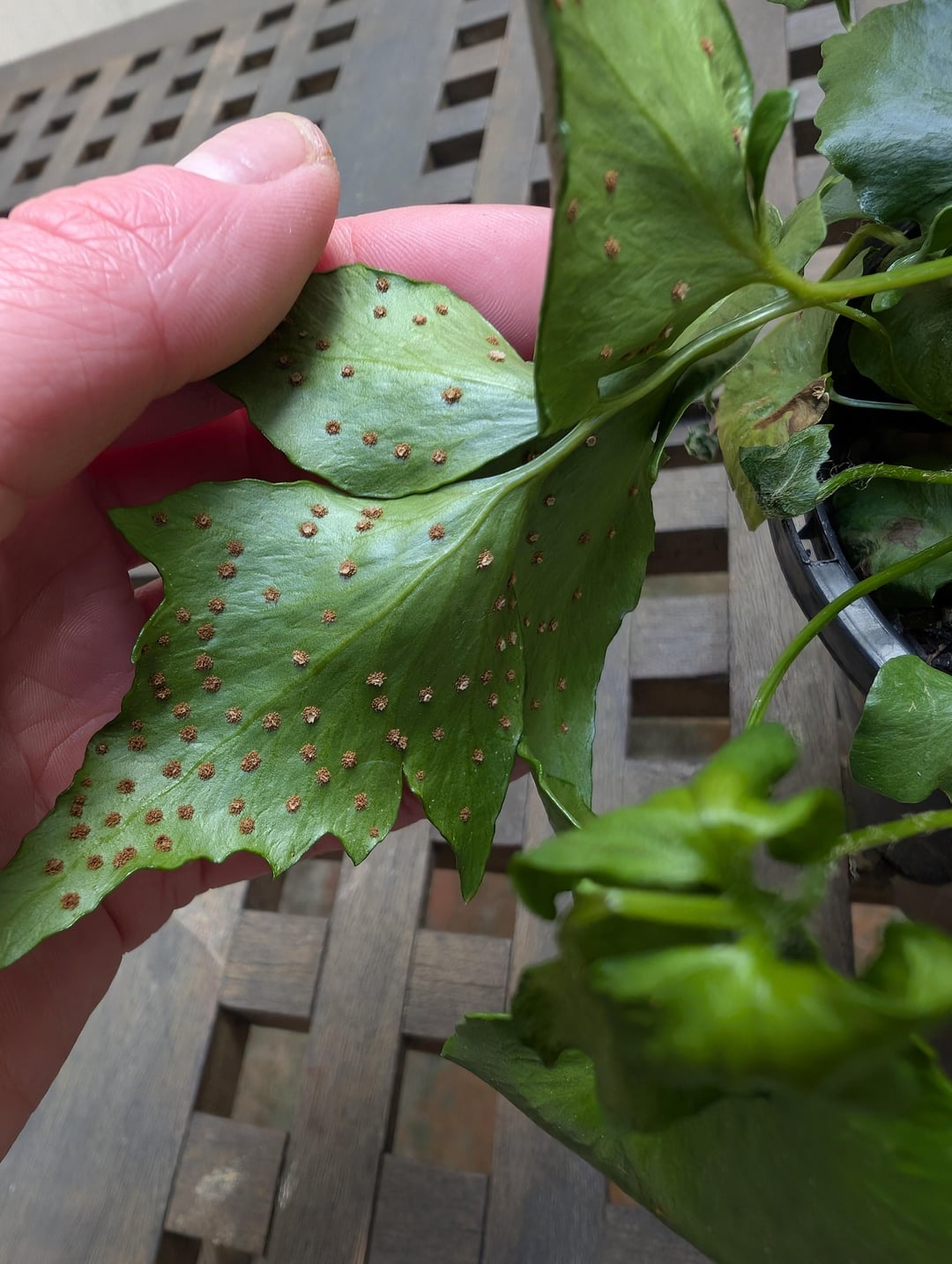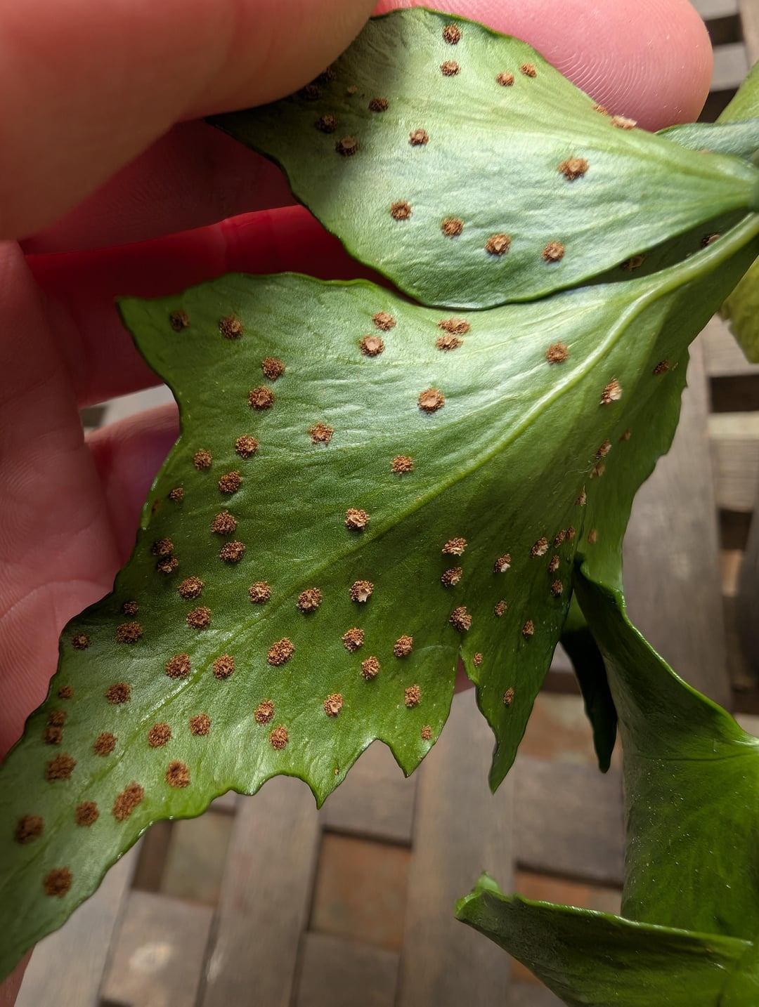 Unlike flowering plants, ferns reproduce using spores instead of seeds. These spores are produced in structures called *sporangia*, which are often clustered into groups known as *sori* on the undersides of the fronds (fern leaves). That’s what’s going on there.