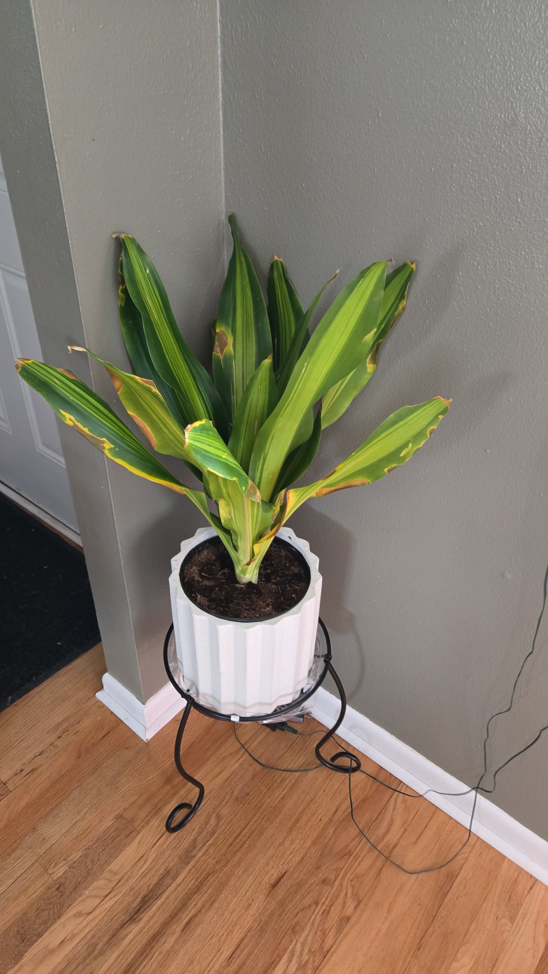 Got this Mass Cane from Lows for $5. The tip were crispy. I got it home cut the tips of the leafs that were brown and wiped a paper towel with Neem oil on each leaf the first day I got it. Ive only had it for 2months and watered it twice. I water it by filling the dish as the bottom with water and dump any remaining water after a few hours. These brown/yellow spots showed up almost over night and about a week after watering it. It sits about a foot from our 3 panel west facing window. No direct light. Ive cut the leafs that were over 50% yellow. Idk what to really do now. Should I cut all the leafs that are brown and repot with new soil? TIAđ