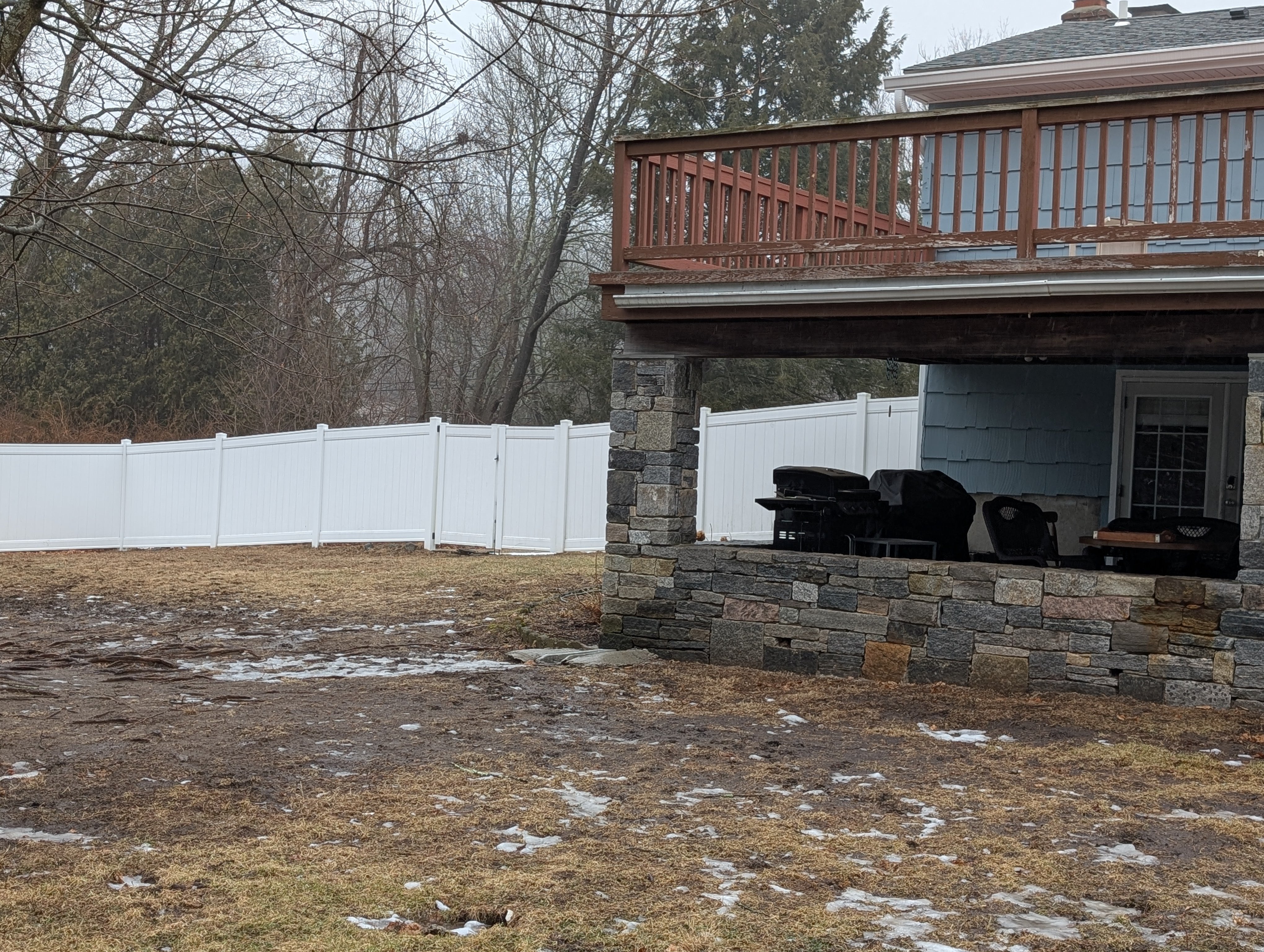 Was originally thinking that planting grass in the spring would help/solve this but I'm starting to think that the water runoff from the deck along with the diverter is what is causing the problem. If that's the case I would be looking for suggestions as to how to solve that problem. Moved in recently and it feels odd this deck would have gutters but no way to properly deal with the water runoff or address drainage.