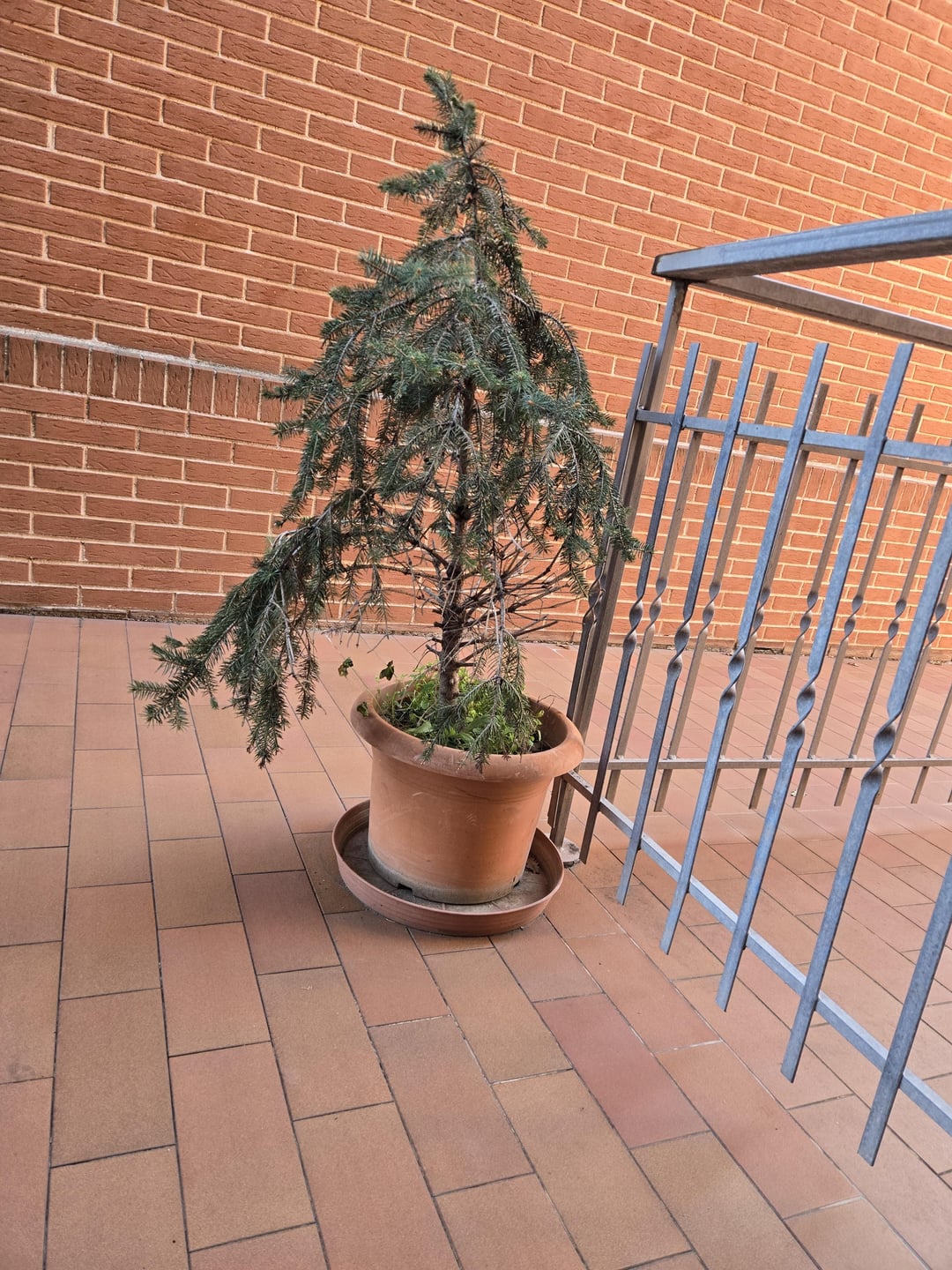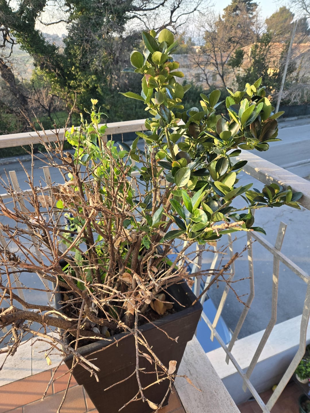 Landlord should not make you care for potted plants. Shouldn’t even make you care for landscape plants those plants are already in rough condition, not sure what first pic is, but 2nd pic looks like honey suckle, the tree is a spruce, and the shrub is a boxwood. Those plants are meant to be in the ground, not a pot. That tree looks so sad, it just wants to be in the ground.