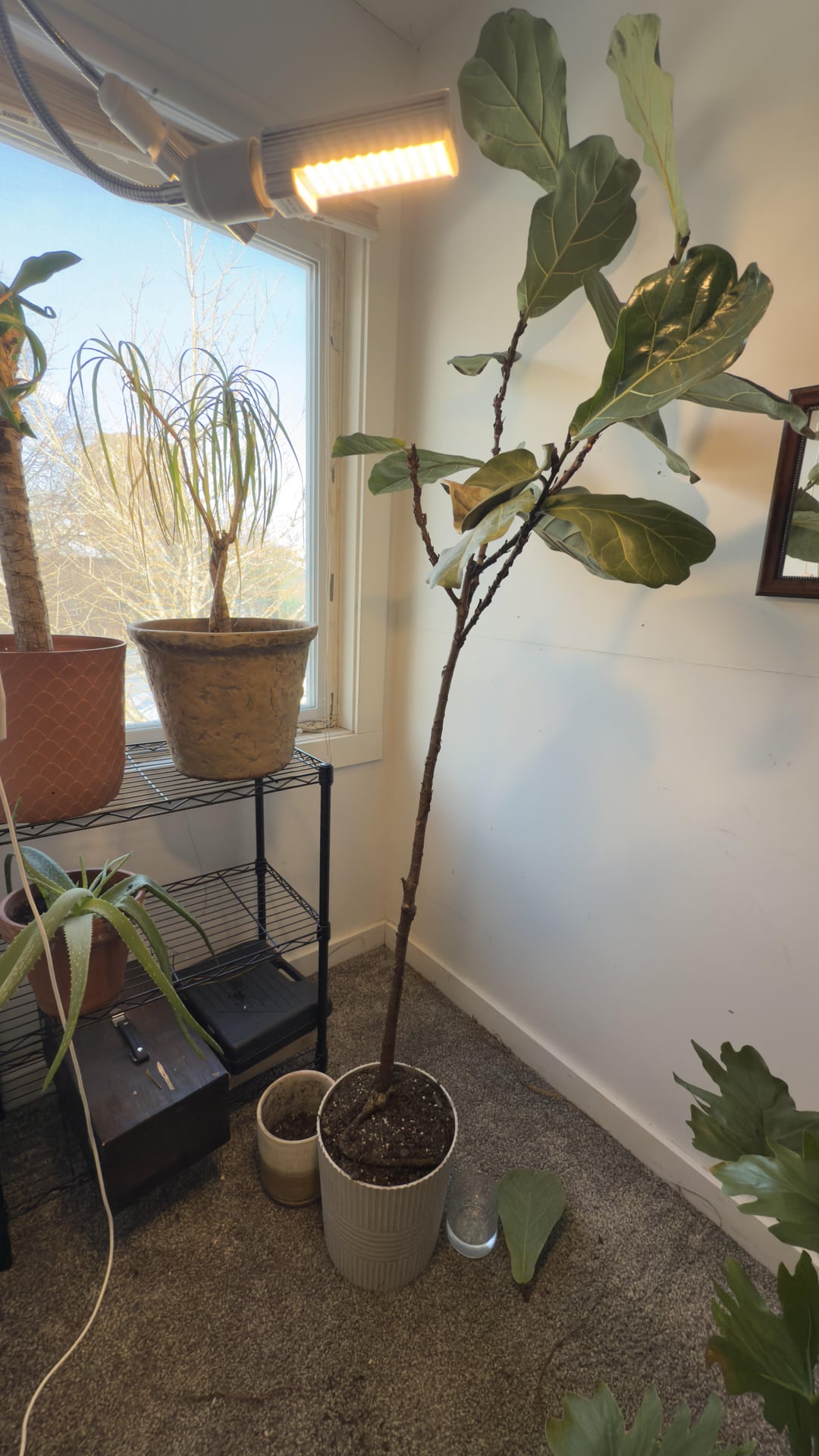 So I got her in good lighting with window and grow lights. She’s fully watered. Tips for a new plant dad? (I will save that yucca and ponytail! Never mind them;)