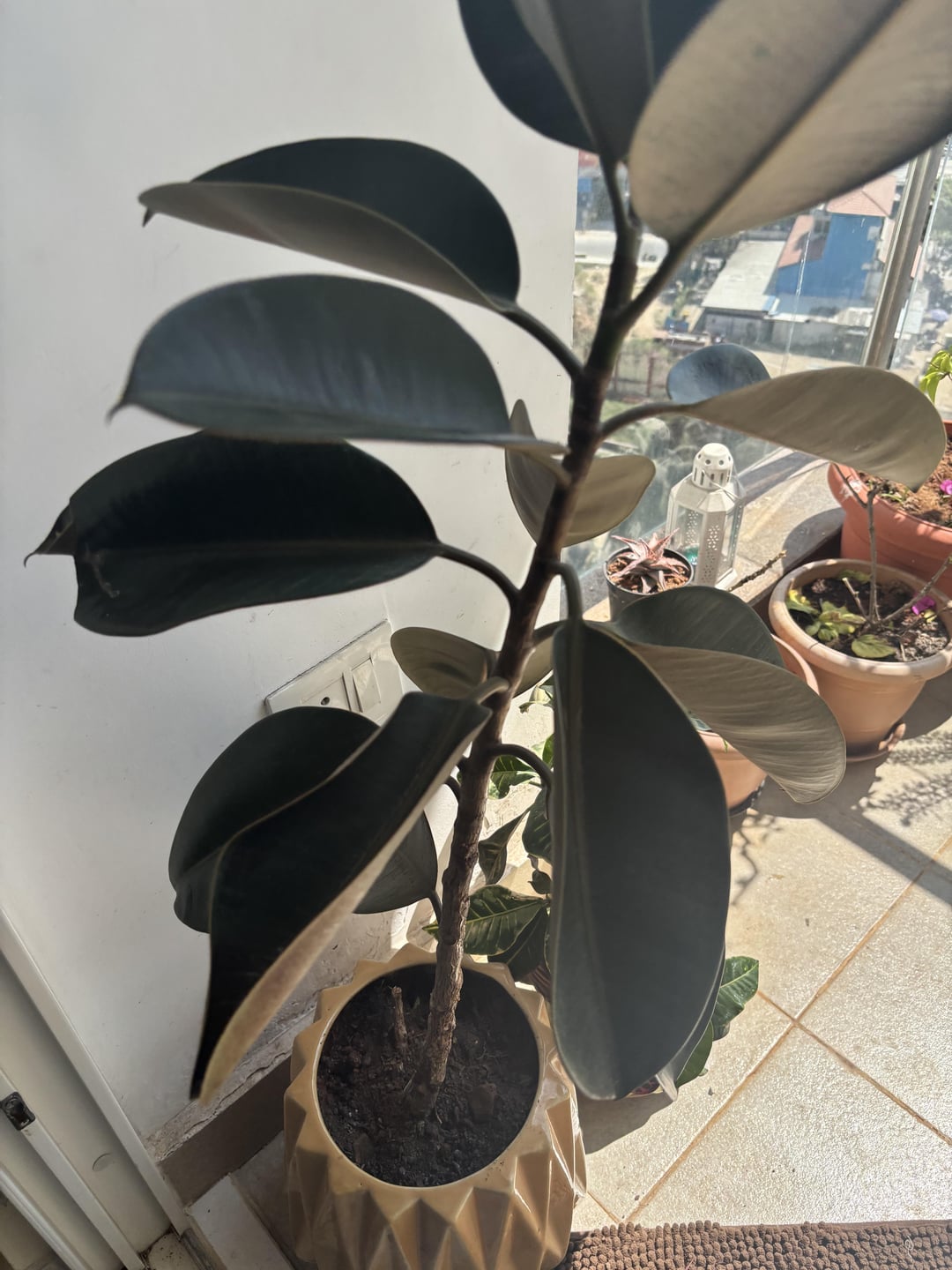 My 5-year-old rubber plant has developed pigmentation and curling leaves. It was kept indoors for most of the year and has been in sunlight since last week, but the issue started even before that. Additionally, all the leaves on the lower branch fell off last month. I water it once a week. What could be the reason?