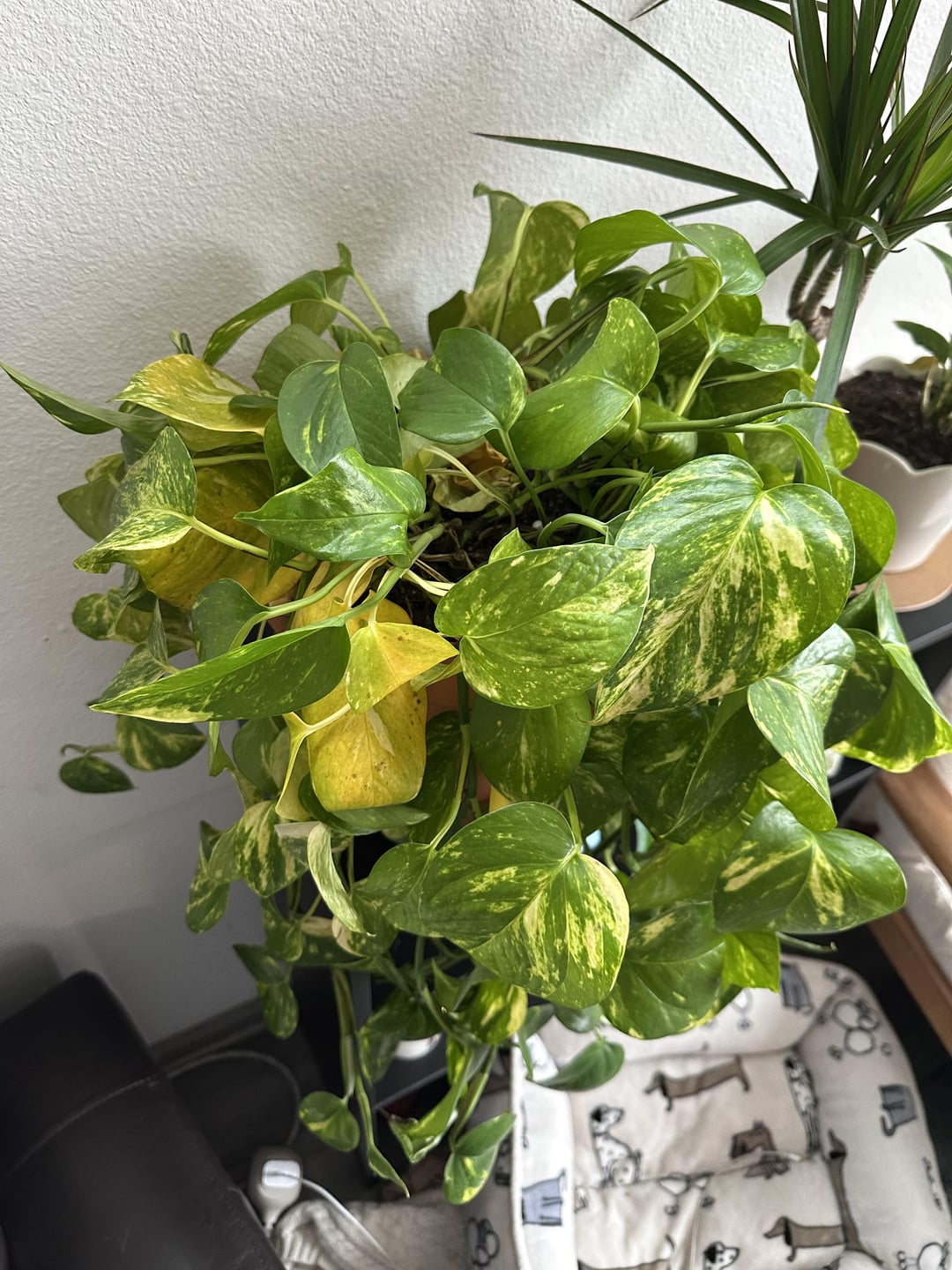 We got this plant from Lowe’s about 2-3 weeks ago. It was repotted as soon as it got home. There are yellowing leaves all around the plant that are starting to die. We’ve been watering it once a week. I don’t know if it makes much of a difference, but it has been cloudy the past week. However, the plant sits in a good spot to get sun with the exception of the part of the pot against the wall.