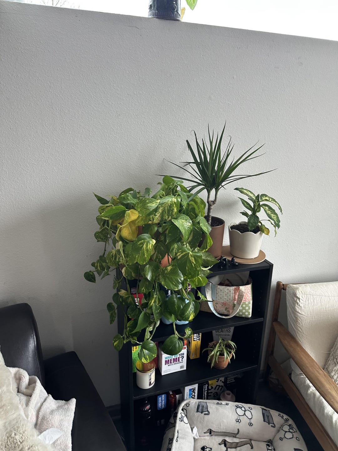 Looks too dark. Put it on the high shelf. It’s going to lose leaves coming from a greenhouse where it gets lots of light if you put it in a dark spot.