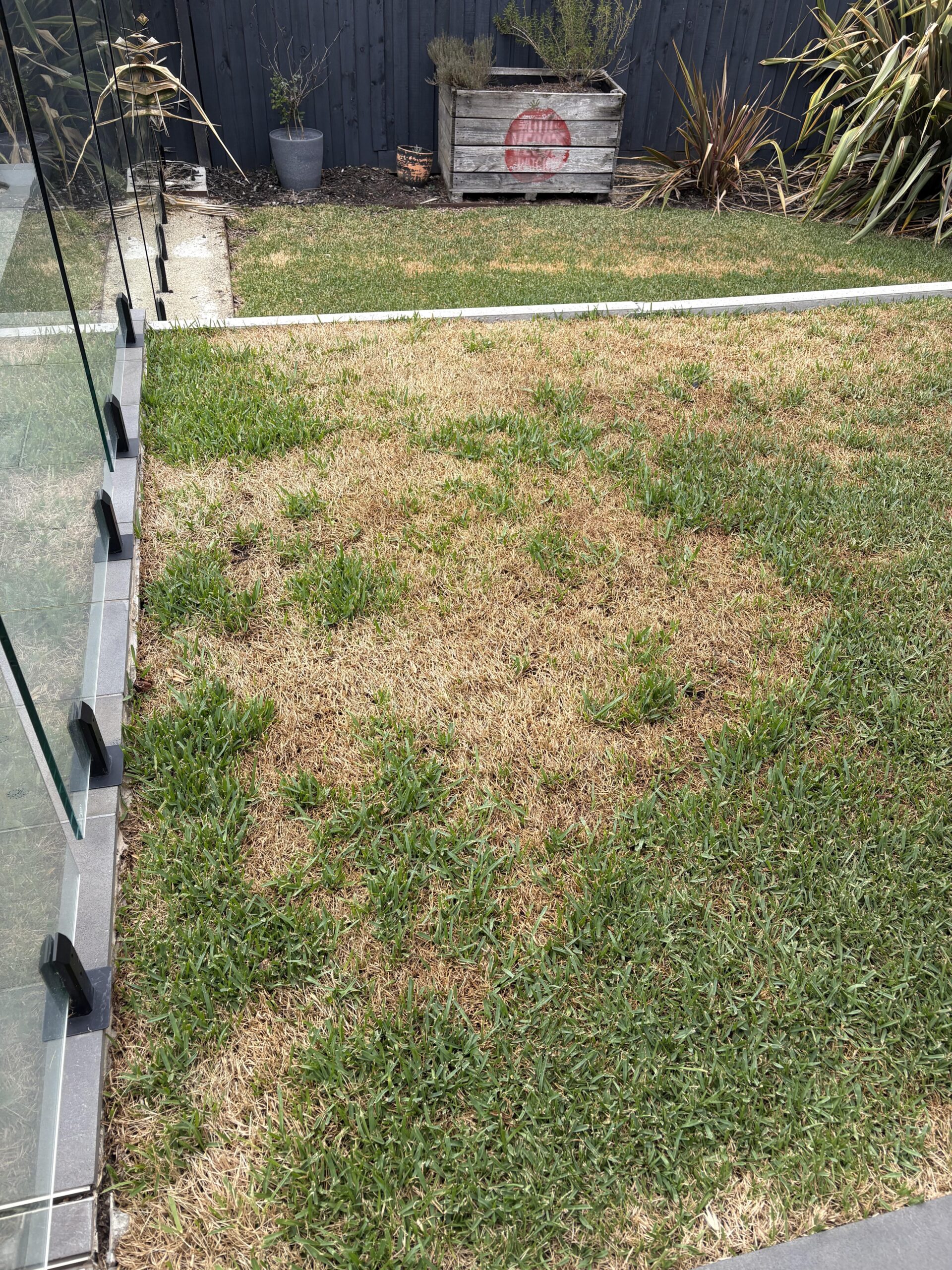 A couple of weeks ago, I noticed a couple of dry patches which I put down to a visitor’s dog peeing on the lawn. I got back from a two-week work trip to the picture attached.