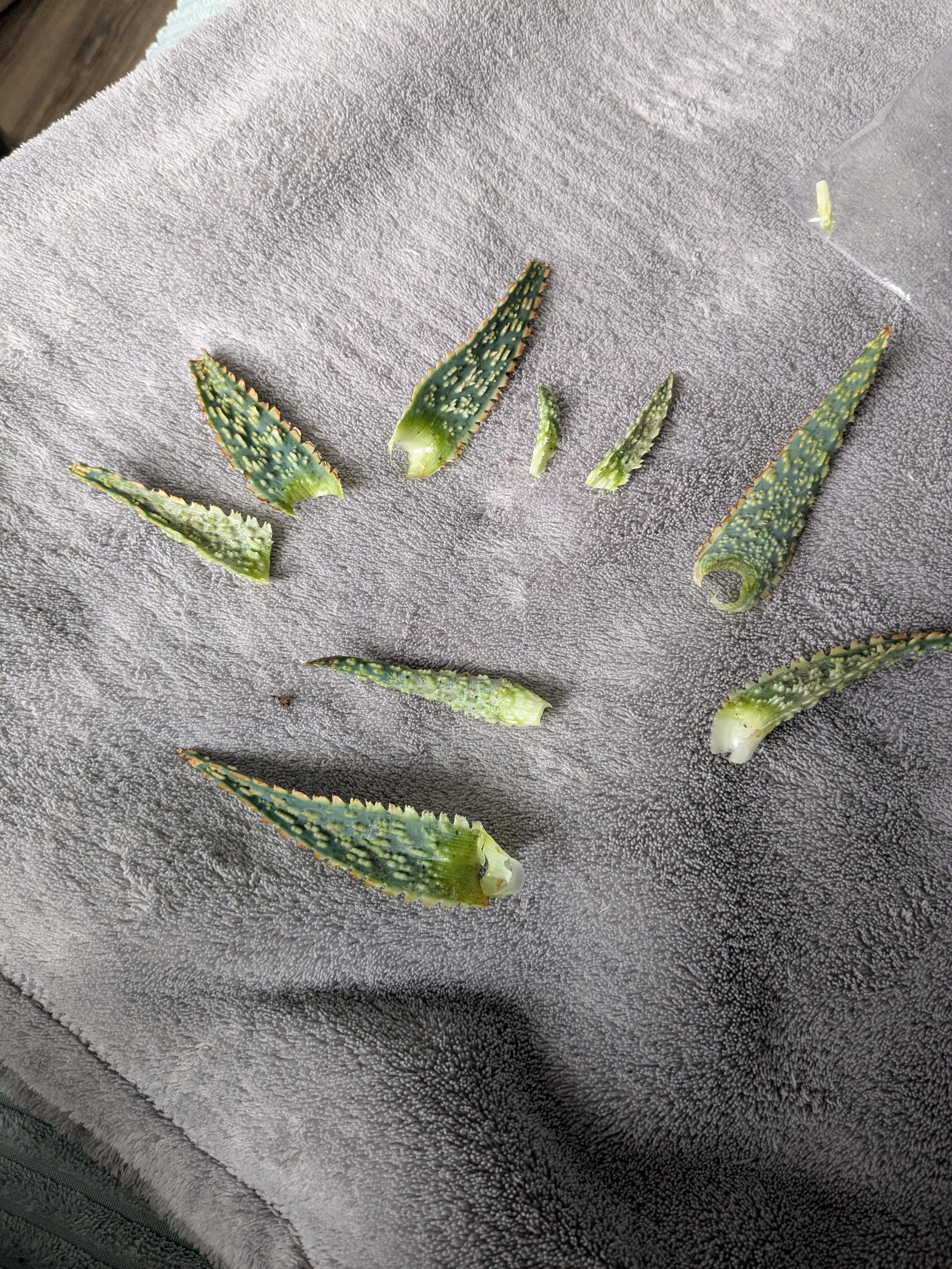 I took a couple of good leaves and promised to try my very best to grow a new plant from one of these leaves. Truth is Ive never propogated an aloe before. What would you guys recommend? As is you can see Ive got nine leaves so nine different opties to try 😁